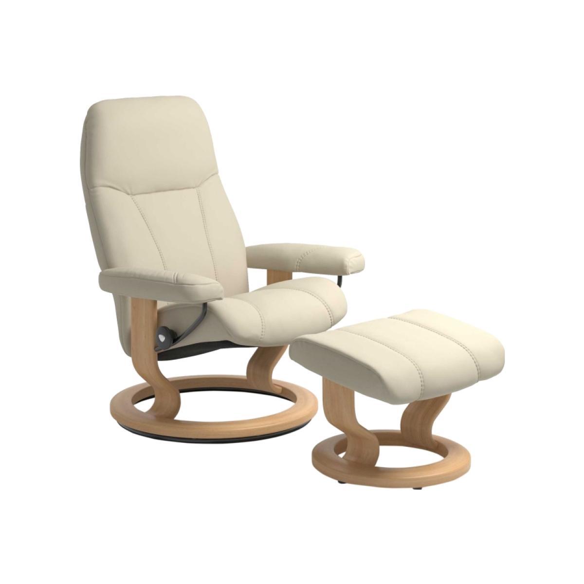 Design. Sophisticated and understated style meets the ultimate in comfort and support, discover the Stressless Consul Small Classic Chair and Stool. The soft luxurious batick cream leather fabric which covers the comfy foam cushion pad works perfectly with the light oak base, coming together for a traditional pairing which will fit in with a number of interior settings.