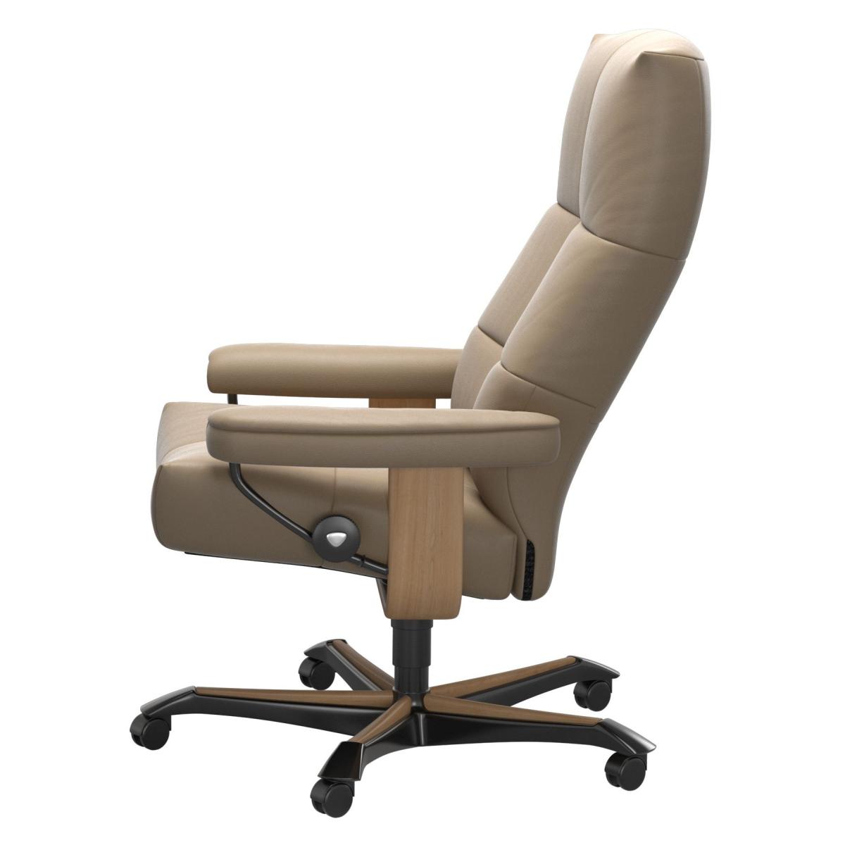 Stressless® David Home Office combines Flexo-springs, Comfort. Zones™ and multiple layers of soft foam providing you with the ultimate comfort experience. Stressless® David keeps you comfortable and supported at all times. The wheels on the base make it easy to move around, and there is a lever under the seat that allows you to adjust the seat height. Features: Plus™-system - Finally, a moment to yourself to recharge your batteries. Watch a film, read a good book or just wind down. Lean back and notice how the chair follows your movements. The unique Plus™ system always gives you maximum comfort and support for your neck and lumbar region, regardless of whether you’re sitting or lying down. The sleep function is activated with a simple hand movement, making your moments of comfort even better. Sleep tight. Glide™-system - Set the friction of the Stressless wheels once and adjust your sitting position simply by using your body weight. Dimensions: Width - 75cm Depth - 69cm Height - 110cm Height max - 117cm Seat height - 47cm Seat height max - 54cm Seat depth - 46cm All screens vary in colour reproduction and whilst every effort has been made to display the colour as accurately as possible it is for guidance only.