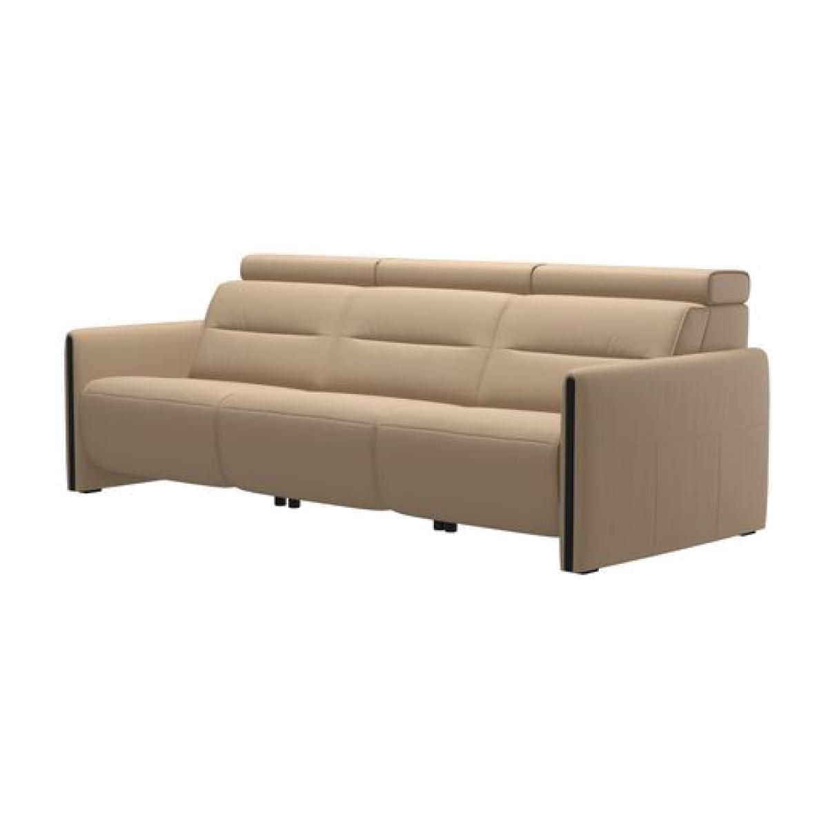 Sleek lines with a modern look give Stressless Emily an embracing appearance. The contemporary design of the soft enveloping cushions invite you to sit down and relax. All seat modules come with an adjustable headrest. Either with fixed seat-back or fitted with motors for personal adjustment of back and leg support. Choose between either steel or wood details on the armrest. The recliners Stressless Tokyo and Stressless View both couples up nicely with the Stressless Emily sofa.