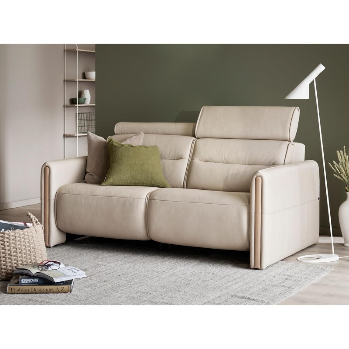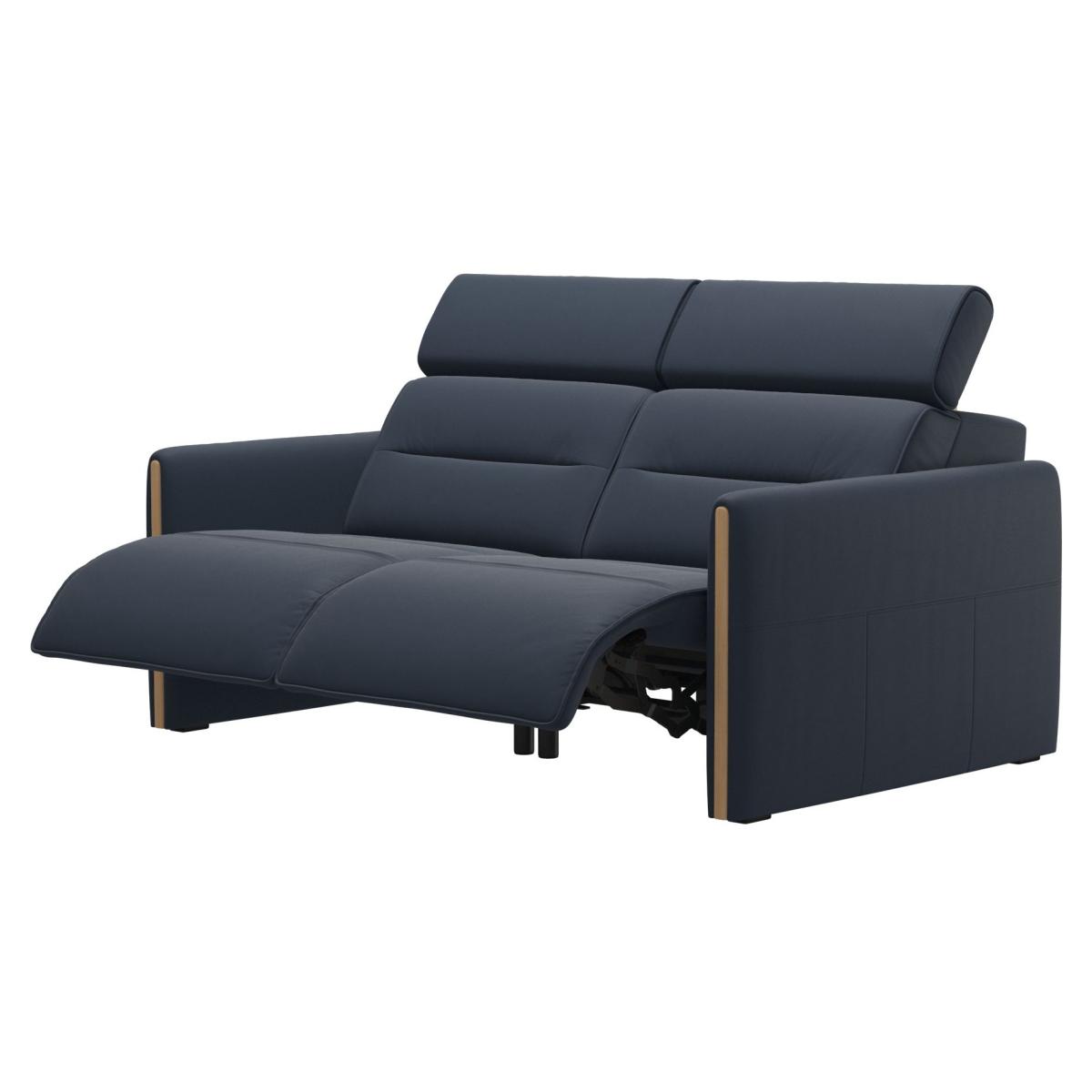 Sleek lines with a modern look give the Stressless Emily Power Recliner Sofa with Wood Arms an embracing appearance. The contemporary design of the soft enveloping cushions invites you to sit down and relax. All seat modules come with an adjustable headrest. This Stressless Emily sofa comes with a reclining option where the sofa is fitted with motors for personal adjustment of back and leg support. A fixed back option is also available here. You can also choose between either steel, wood, or wide arms. The Emily range from Stressless is available in a variety of leathers and fabrics. 2 Seater Dimensions: Height: 88cm Width: 174cm Depth: 102cm Seat Height: 45cm Seat Depth: 58cm The Emily is displayed here in Paloma Oxford Blue with Oak finished armrests. All screens vary in colour reproduction and whilst every effort has been made to display the colour as accurately as possible it is for guidance only.