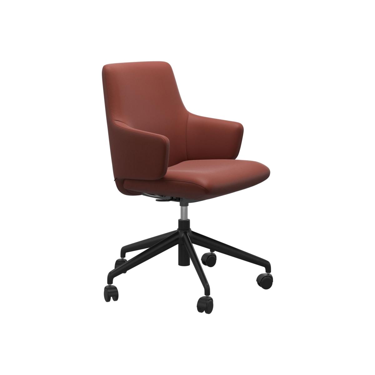 The Stressless® Laurel Office Chair has a light design that will blend in with any style. The seat and back follow your movements and offer good support, giving you the possibility to effortlessly shift position during the day.. Lean back, and the backrest will recline while the seat moves forward in a coordinated movement. A discrete flexibility in the seat offers good support and reduces the pressure on your lower thighs as you lean forward. Offering a high level of versatility, the wheels on the base make it easy to move around, and there is a lever under the seat that allows you to adjust the seat height by up to 12 centimetres, while the large choice of upholstery makes it easy to customise and match with the rest of your interior.