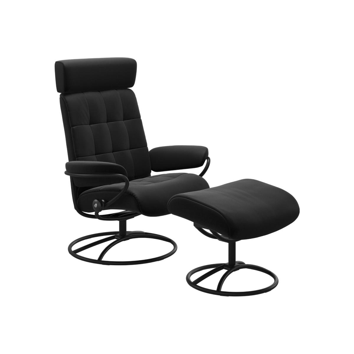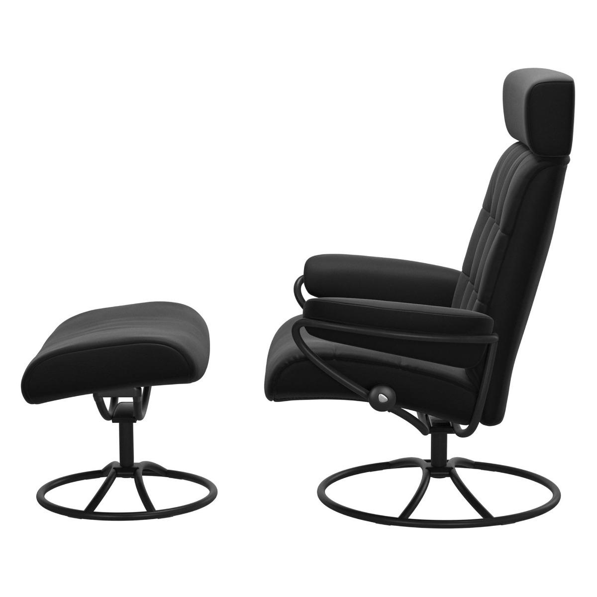 Design. Inspired by the 60s, The Stressless London Original High Back Chair and Stool, Matt Black is an absolute classic. With soft. Fibre. Cushioning wrapped in a luxurious matt black leather, this recliner not only brings a sophisticated, stylish look into your living space. ,. But provides extreme comfort with all the Stressless functionalities. Featuring the stunning matching stool, give your feet some well-deserved rest.