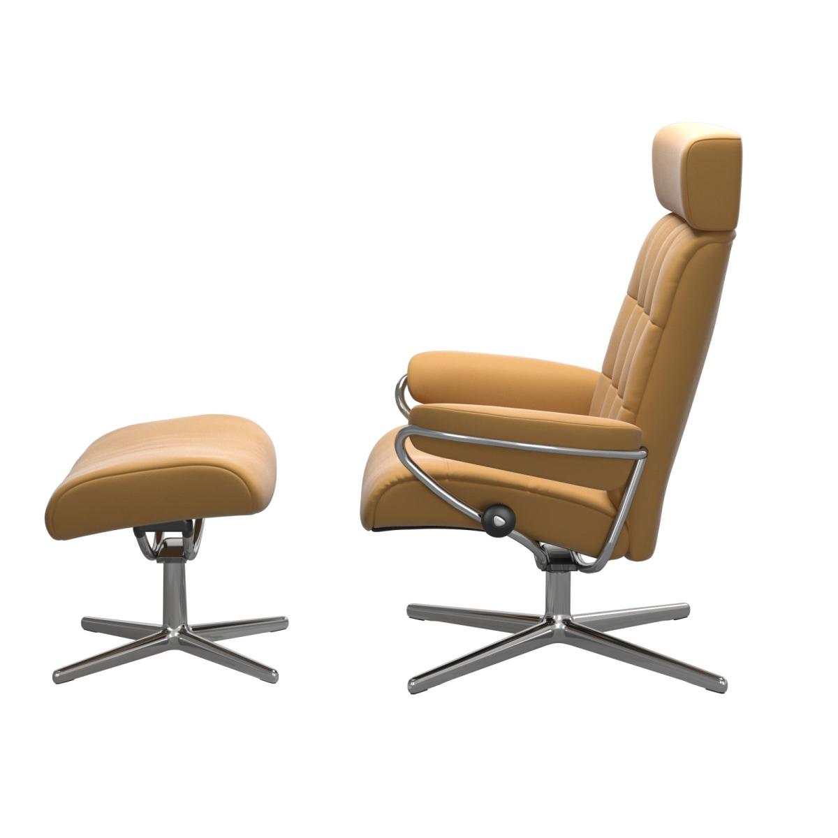 The Stressless® London recliner is inspired by the designs of the 60s. Although this beautiful recliner has got all the potential of becoming a true classic, that doesn’t mean any of the characteristic Stressless® comfort has been sacrificed. With an adjustable headrest, the matching footstool lets you put your feet up and properly relax with all the support you need, especially with the stylish yet sturdy cross base. Choose from a variety of leather swatches to make this recliner set uniquely yours.