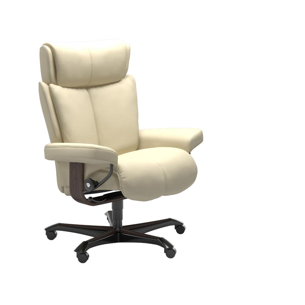 The Stressless Magic Office chair comes with many unique comfort features. The Stressless Glide system automatically adjusts to your body weight. The chair can easily and smoothly be height-adjusted by using the handle under the seat. The base with wheels is carefully developed and designed to give optimal stability and the freedom of 360 movement. The Plus system provides continuous support for your head and lower back. The internal contruction features a double-sided mechanism to ensure maximum stability and functionality. The durable steel frame and flexo springs provide for superior resilience and continuous support. And don't forget that we guarantee the internal mechanism for 10 years.