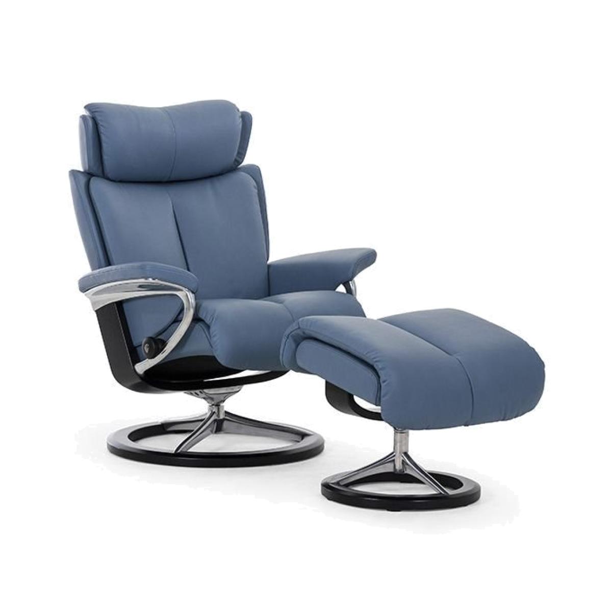 With an adjustable head rest, luxe cushioning and meticulously sculpted proportions, the. Is amongst the most comfortable of Stressless recliners. The foam and fibres on this recliner give you full body support for the ultimate relaxation. Also featuring the Signature base, an elegant combination of wood and steel. This base with BalanceAdapt™ has a gentle rocking motion that helps you find the perfect sitting position by adjusting the seat and back angle to your movement. A tall back adds to the comfort of this wonderfully engineered statement reclining chair and the footstool complements the comfort of the recliner with a built in glide movement to respond to your every move.