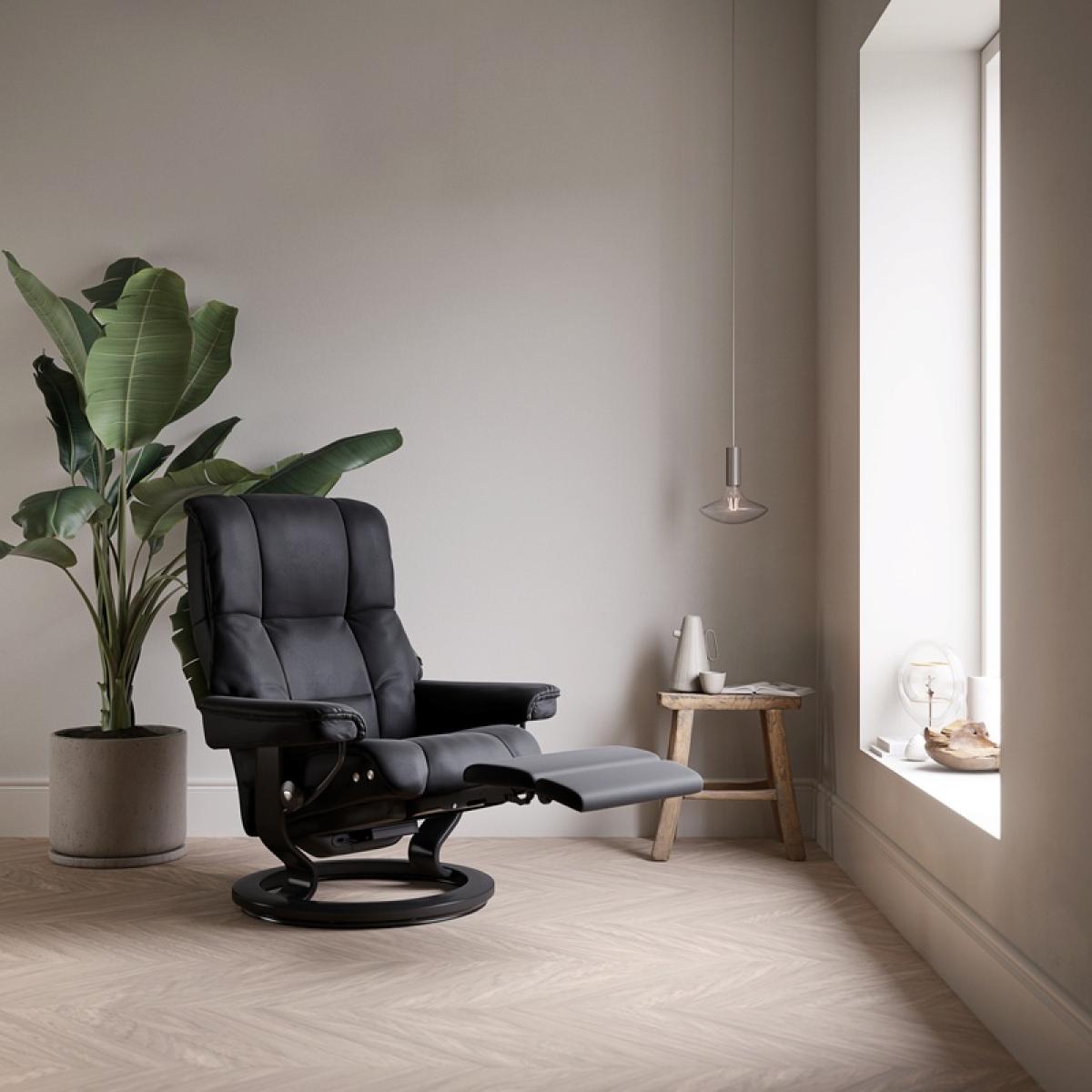 The Stressless Mayfair range is the most popular of all the chairs we sell. Enjoy just a brief relax in the Mayfair and you will understand why it continues to be the favourite. This Stressless Mayfair chair has soft luxurious and yet supportive padding along with all the Stressless reclining features you expect. This is the new power version featuring the Classic Base styling but instead of needing a footstool, you simply press a button on the side of the chair to extend a footrest that is cleverly tucked away under the seat when not required. Choose from a Single power motor for leg support or a Dual power motor for leg and back support. This base option made from solid laminated beech and now available in eight different wood stains. All screens vary in colour reproduction and whilst every effort has been made to display the colour as accurately as possible it is for guidance only. Please also bear in mind that leather is a natural product. No two hides are exactly the same and there may be subtle shade variation between pieces which is perfectly normal. Plus™ system- The unique Plus™ system always gives you maximum comfort and support for your neck and lumbar region, regardless of whether you’re sitting or lying down. Stressless® Power - motorised comfort activated by neatly concealed buttons Medium Dimensions: Height: 101cm Width: 79cm Depth: 77cm Seat Height: 46cm Large Dimensions Height: 102cm Width: 88cm Depth:76cm Seat Height: 46cm