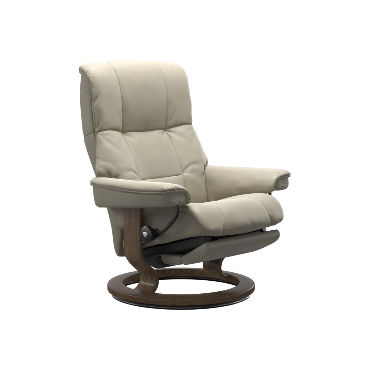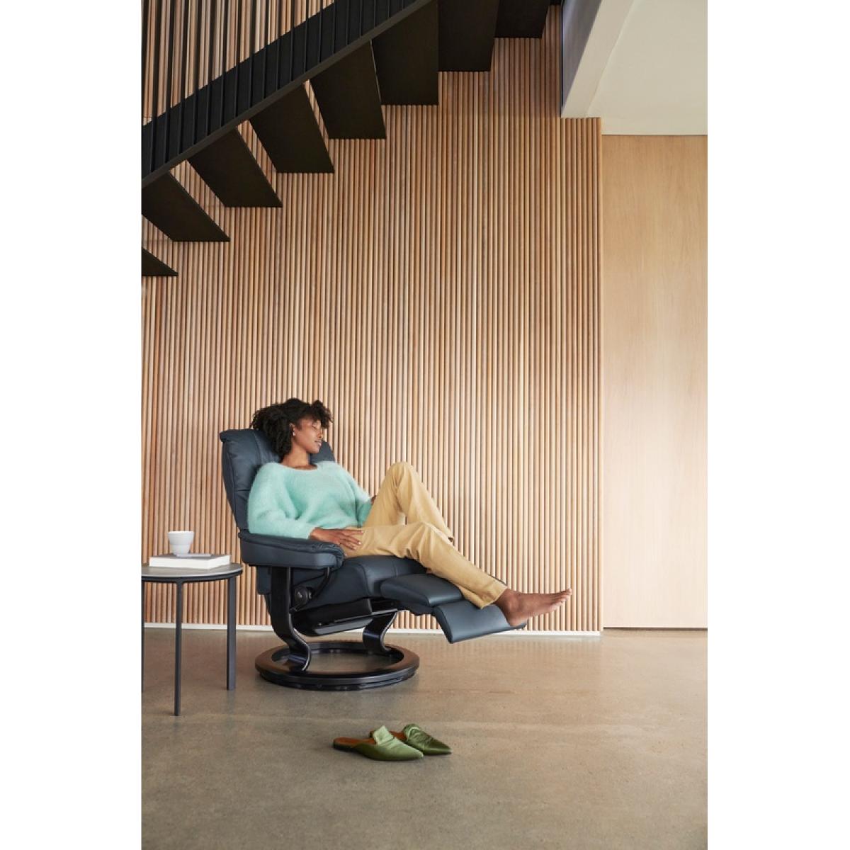 The Stressless Mayfair range is the most popular of all the chairs we sell. Enjoy just a brief relax in the Mayfair and you will understand why it continues to be the favourite. This Stressless Mayfair chair has soft luxurious and yet supportive padding along with all the Stressless reclining features you expect. This is the new power version featuring the Classic Base styling but instead of needing a footstool, you simply press a button on the side of the chair to extend a footrest that is cleverly tucked away under the seat when not required. Choose from a Single power motor for leg support or a Dual power motor for leg and back support. This base option made from solid laminated beech and now available in eight different wood stains. All screens vary in colour reproduction and whilst every effort has been made to display the colour as accurately as possible it is for guidance only. Please also bear in mind that leather is a natural product. No two hides are exactly the same and there may be subtle shade variation between pieces which is perfectly normal. Plus™ system- The unique Plus™ system always gives you maximum comfort and support for your neck and lumbar region, regardless of whether you’re sitting or lying down. Stressless® Power - motorised comfort activated by neatly concealed buttons Medium Dimensions: Height: 101cm Width: 79cm Depth: 77cm Seat Height: 46cm Large Dimensions Height: 102cm Width: 88cm Depth:76cm Seat Height: 46cm