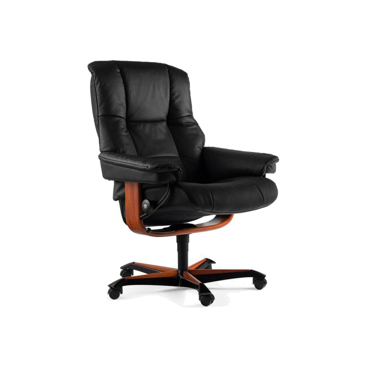 The Stressless Mayfair office chair has a perforated form that is moulded directly over the frame, which produces higher levels of comfort. With a wide variety of top quality leathers to choose from, you can create the perfect look to fit in with your home décor. The Stressless Mayfair office chair features a whole host of features that have your comfort in mind, the 360 degrees movement is designed to adjust with only the slightest push of your feet requiring little effort with great stability. The Plus System automatically adjusts to provide the correct support for both your head and lumbar area in all positions. This means that you can enjoy perfect comfort whether you are reclining or sat upright. Another amazing feature is the Stressless Glide System, which glides into the position of your choice with ease, automatically adjusting with your body's movement with smooth adjustments. For total peace of mind, Stressless guarantee the internal mechanism on all recliners for a period of 10 years from the date of purchase. The 10-year guarantee covers the Plus-system and the internal metal frame, including the metal springs and gliding system. It does not cover damage to leather or woodwork or any faults or damage caused by the use of the product other than in accordance with the manufacturer's recommendations, as well as any faults or damage arising from any repairs made by any persons not authorised by the manufacturer. All screens vary in colour reproduction and whilst every effort has been made to display the colour as accurately as possible it is for guidance only. Please also bear in mind that leather is a natural product. No two hides are exactly the same and there may be subtle shade variation between pieces which is perfectly normal.
