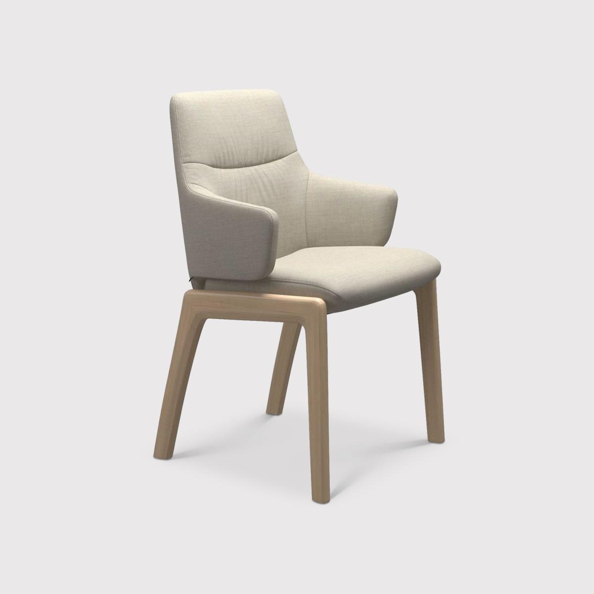 The Stressless Mint Low Back Dining Armchair ensures a comfortable upright seat, surrounded by thick arms for further support. The oak wood legs compliment the light beige of the seat upholstery, instilling style when placed around a dining table of your choice.