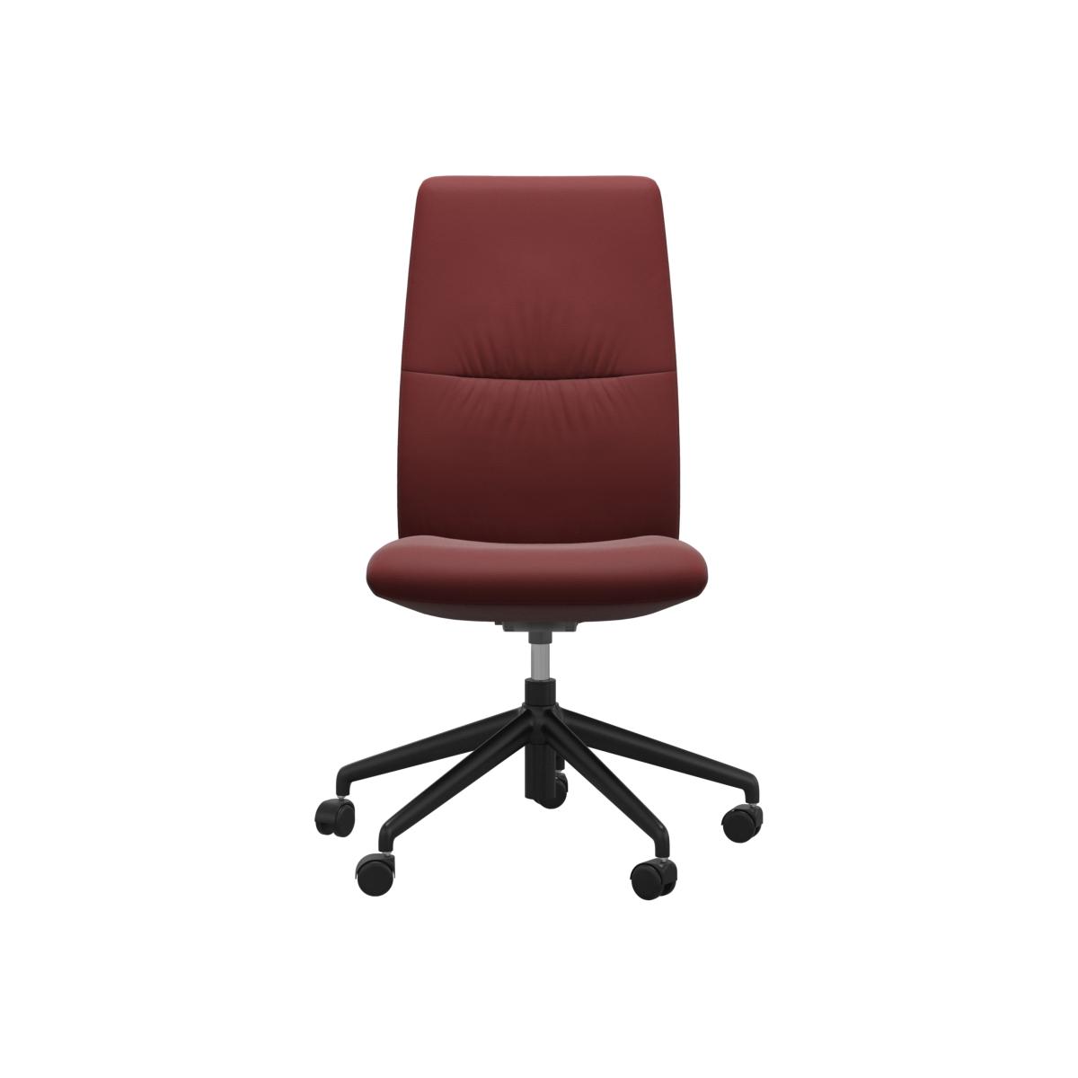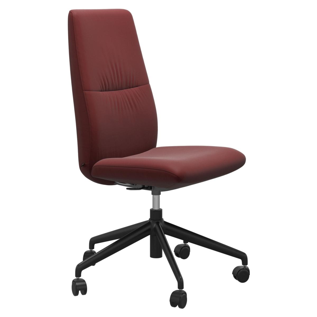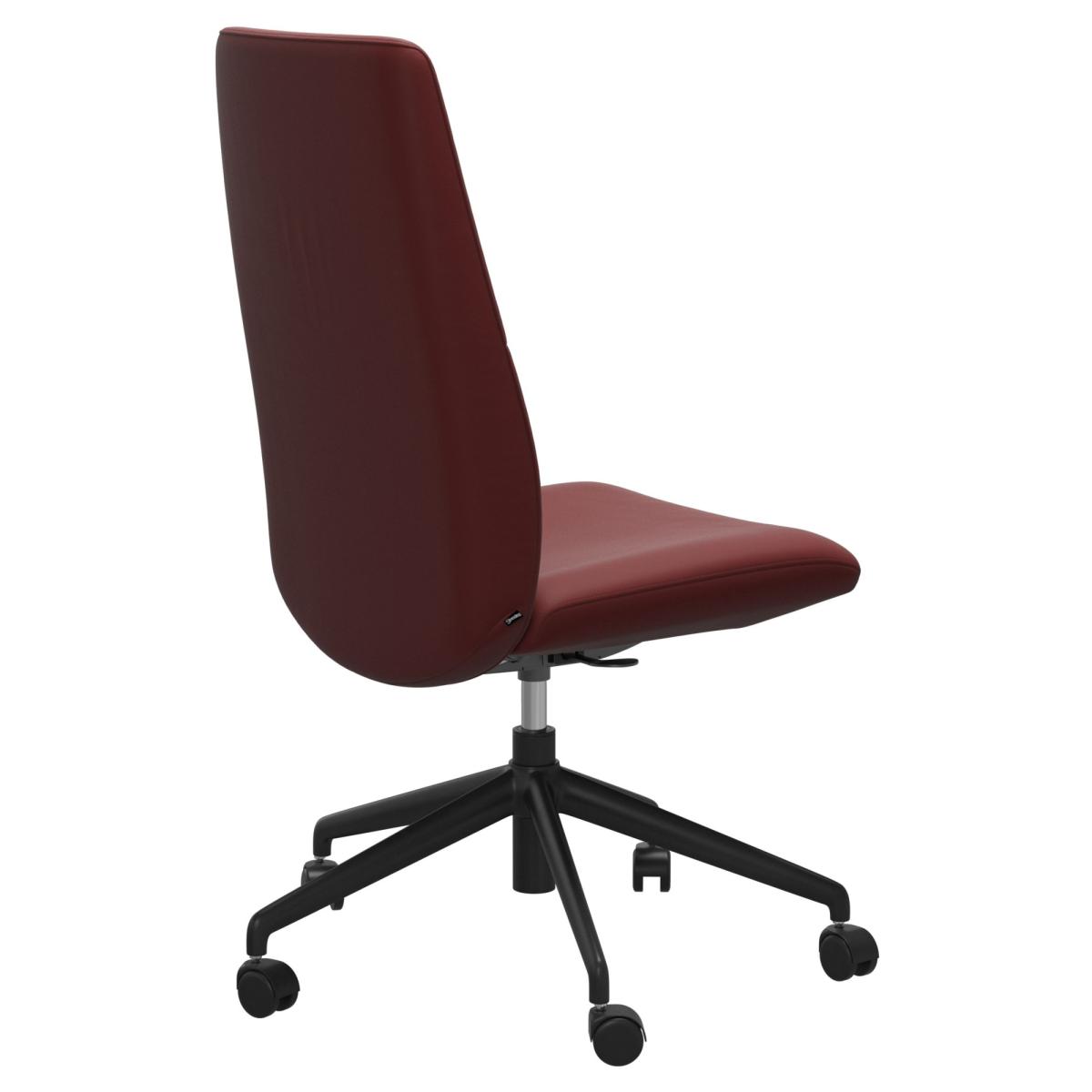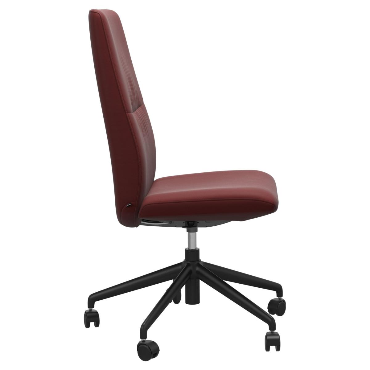 The Stressless Mint Home Office chairs have a light design that will blend in with any style. The chairs give you the possibility to effortlessly shift position during the day. The seat and back follow your movements and offer good support. Lean back, and the backrest will recline while the seat moves forward in a coordinated movement. A discrete flexibility in the seat offers good support and reduces the pressure on your lower thighs as you lean forward. The large choice of covers makes it easy to match with the rest of the interior, and you can even get dining chairs with the exact same cushion design and covers. The wheels on the base make it easy to move around, and there is a lever under the seat that allows you to adjust the seat height by up to 12 centimetres. Dimensions - W 72cm x D 72cm x H 100-112cm Seat Height - 43-55cm x Seat Depth 45cm Wheeled Base BalanceAdapt Glide System Available in a choice of high quality Stressless fabrics and leathers Shown here in Paloma Cherry leather and Matte Black metal finish base All screens vary in colour reproduction and whilst every effort has been made to display the colour as accurately as possible it is for guidance only.
