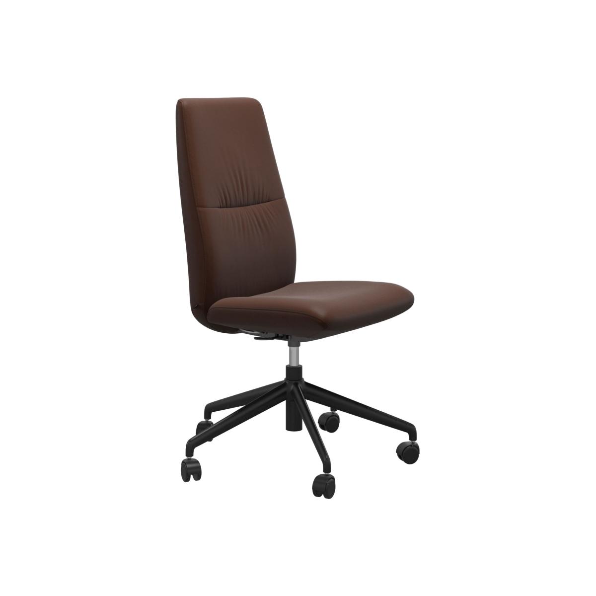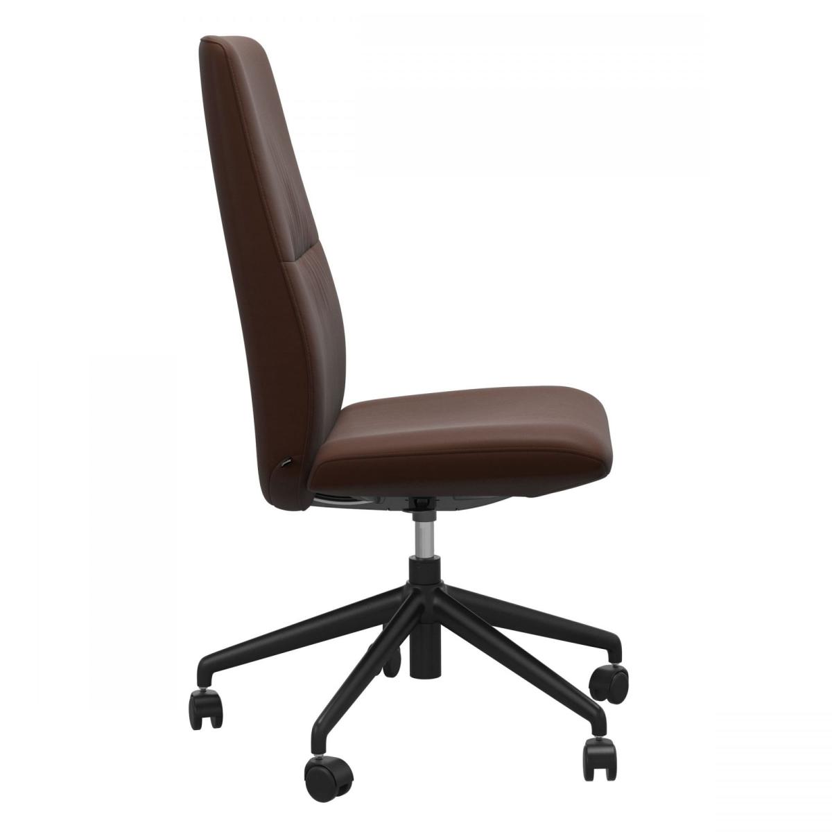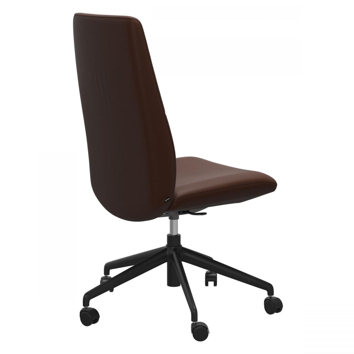Stressless® Home Office chairs have a light design that will blend in with any style. The chairs give you the possibility to effortlessly shift position during the day. The seat and back follow your movements and offer good support. Lean back, and the backrest will recline while the seat moves forward in a coordinated movement. A discrete flexibility in the seat offers good support and reduces the pressure on your lower thighs as you lean forward. The large choice of covers makes it easy to match with the rest of the interior, and you can even get dining chairs with the exact same cushion design and covers. The wheels on the base make it easy to move around, and there is a lever under the seat that allows you to adjust the seat height by up to 12 centimetres.