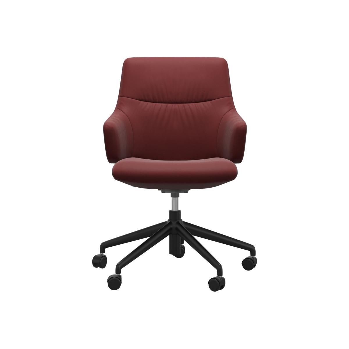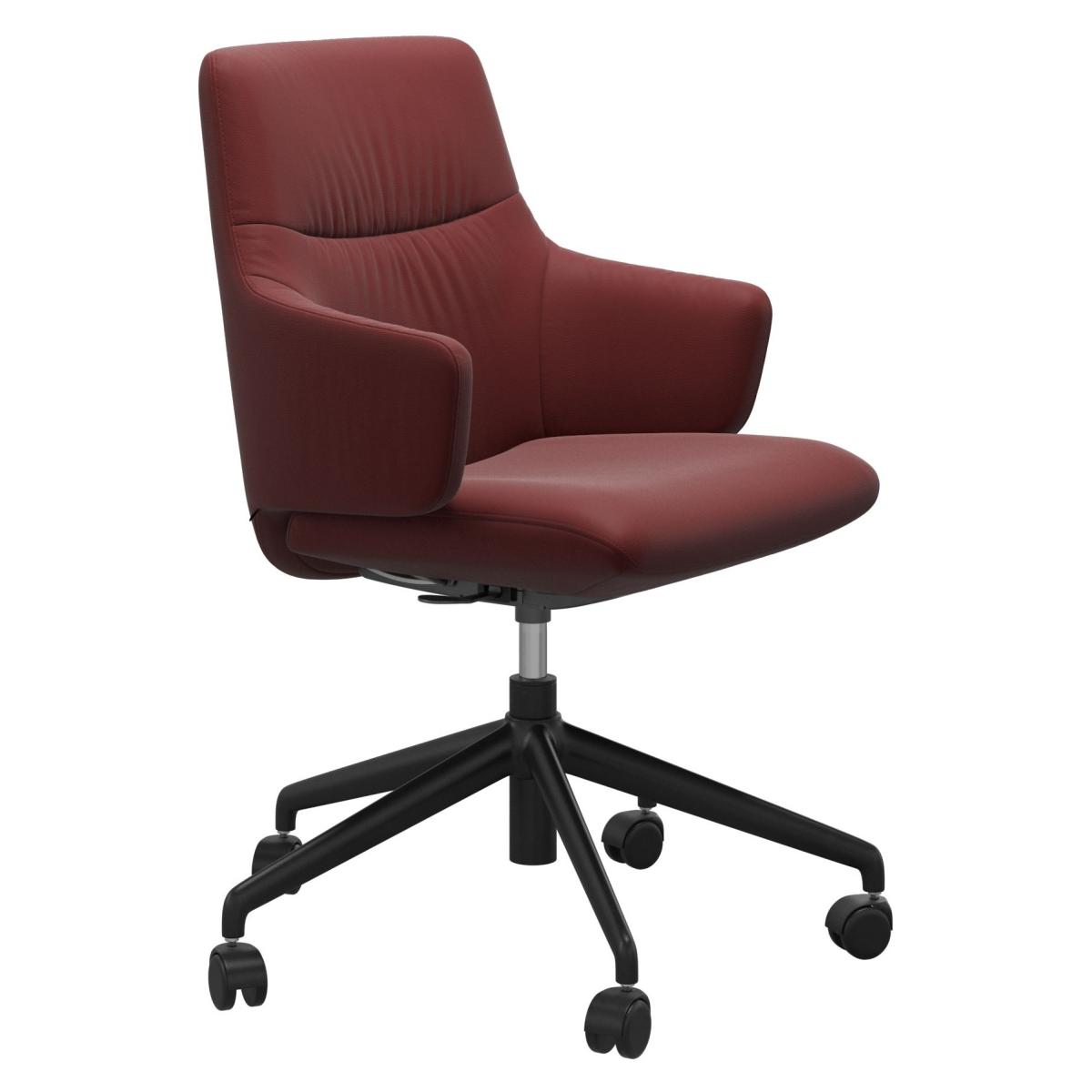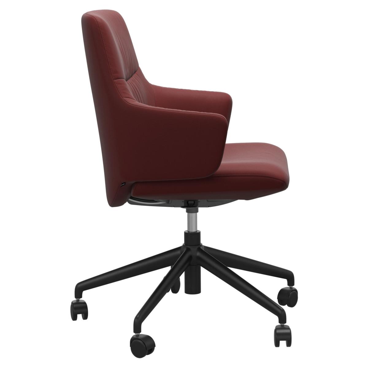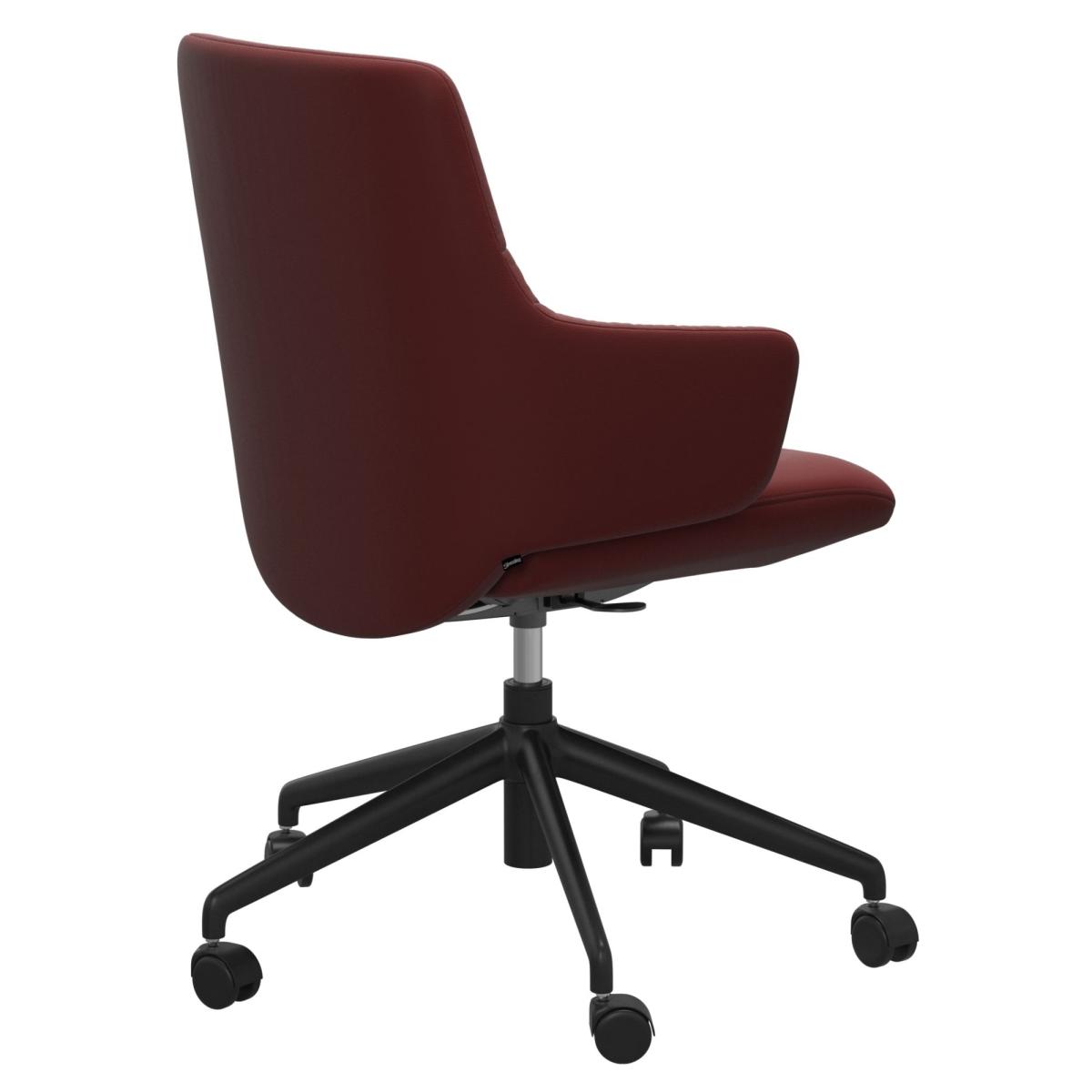 The Stressless Mint Home Office chairs have a light design that will blend in with any style. The chairs give you the possibility to effortlessly shift position during the day. The seat and back follow your movements and offer good support. Lean back, and the backrest will recline while the seat moves forward in a coordinated movement. A discrete flexibility in the seat offers good support and reduces the pressure on your lower thighs as you lean forward. The large choice of covers makes it easy to match with the rest of the interior, and you can even get dining chairs with the exact same cushion design and covers. The wheels on the base make it easy to move around, and there is a lever under the seat that allows you to adjust the seat height by up to 12 centimetres. Dimensions - W 72cm x D 72cm x H 87-99cm Seat Height - 43-55cm x Seat Depth 45cm Wheeled Base BalanceAdapt Glide System Available in a choice of high quality Stressless fabrics and leathers Shown here in Paloma Cherry leather and Matte Black metal finish base All screens vary in colour reproduction and whilst every effort has been made to display the colour as accurately as possible it is for guidance only.