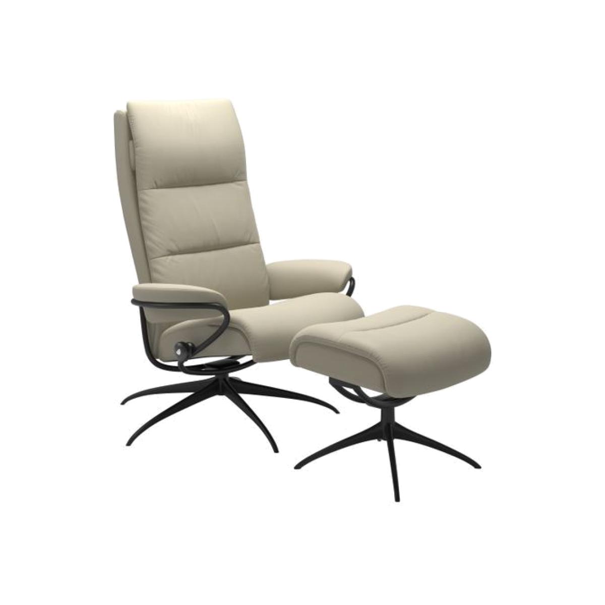 Embracing comfort. Stressless Tokyo has a slim back with a comfortable and soft padded cushion. Add the well known Stressless features and you get a modern looking recliner with sublime comfort. Set the friction of the Stressless wheels once and adjust your sitting position simply by using your body weight. Featuring BalanceAdapt, . Subtle rocking increases the comfort – it’s all about finding the right balance. With BalanceAdapt the sitting angle automatically adjusts to your body’s tiniest movement. Lean back and notice how the chair follows your movements. The unique Plus™ system always gives you maximum comfort and support for your neck and lumbar region, regardless of whether you’re sitting or lying down. The sleep function is activated with a simple hand movement, making your moments of comfort even better. BalanceAdapt mechanism with locking function - the sitting angle automatically adjusts to your body's every movement 10-year guarantee on the internal mechanism Large choice of leathers and fabrics Choice of leg colour - matte black or chrome Dimensions:Chair: 80cm W x 81cm D x 113cm H. Seat height: 50cm. Seat Depth: 49cm. Stool: 52cm W x 46cm D x 50cm H Assembly required