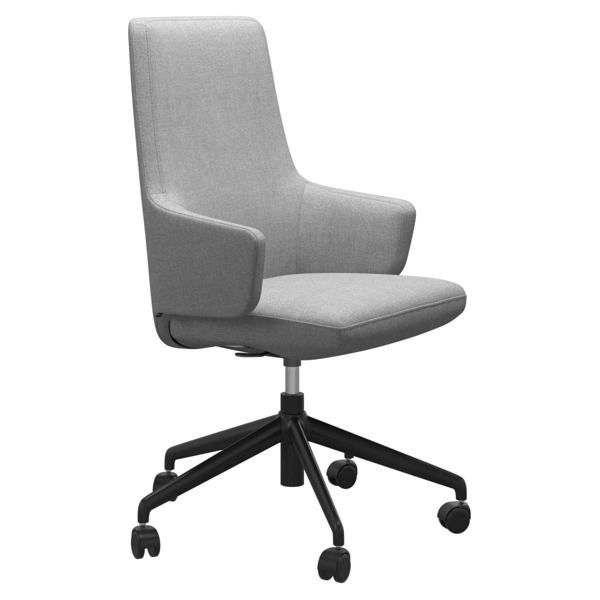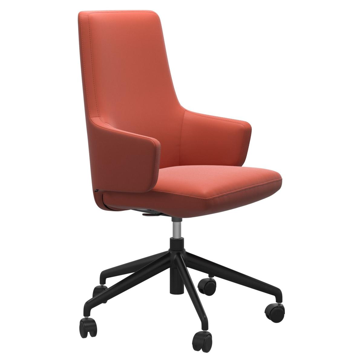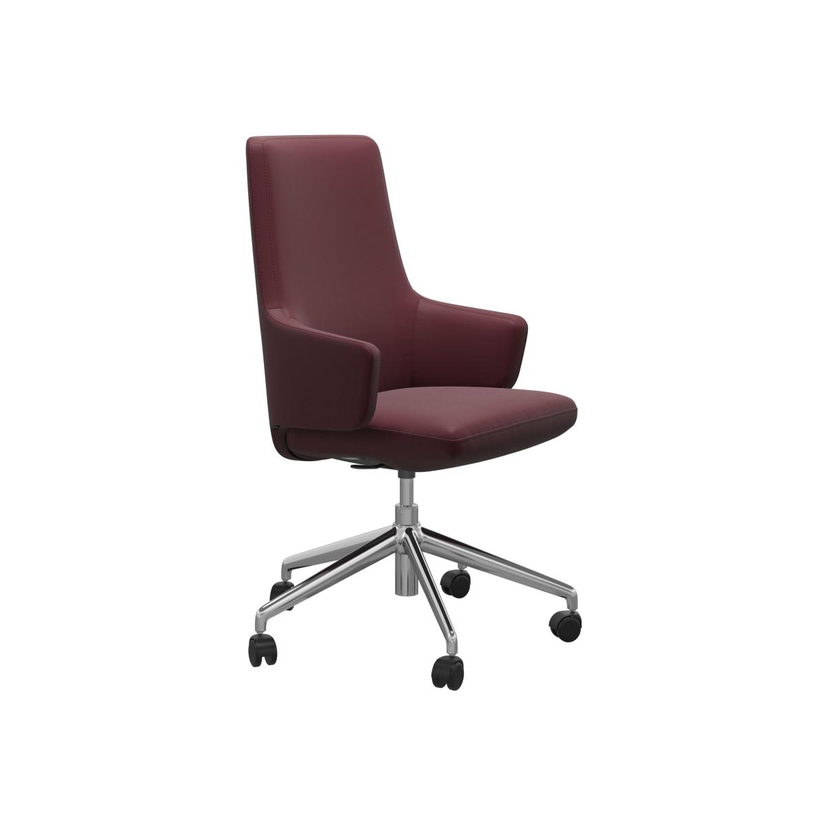 The Stressless Vanilla Home Office chairs have a light design that will blend in with any style. The chairs give you the possibility to effortlessly shift position during the day. The seat and back follow your movements and offer good support. Lean back, and the backrest will recline while the seat moves forward in a coordinated movement. A discrete flexibility in the seat offers good support and reduces the pressure on your lower thighs as you lean forward. The large choice of covers makes it easy to match with the rest of the interior, and you can even get dining chairs with the exact same cushion design and covers. The wheels on the base make it easy to move around, and there is a lever under the seat that allows you to adjust the seat height by up to 12 centimetres. Dimensions - W 72cm x D 72cm x H 100cm Seat Height - 43cm x Seat Depth 45 cm Wheeled Base BalanceAdapt Glide System Available in a choice of high quality Stressless fabrics and leathers Shown here in leather and metal finish base All screens vary in colour reproduction and whilst every effort has been made to display the colour as accurately as possible it is for guidance only. Image 1 shows the Vanilla High Back Chair in Clover Grey with Matte Black LegsImage 2 shows the Vanilla High Back Chair in Batick Bordeaux with Chrome legsImage 3 shows the Vanilla High Back Chair in Paloma Henna with Matte Black Legs.