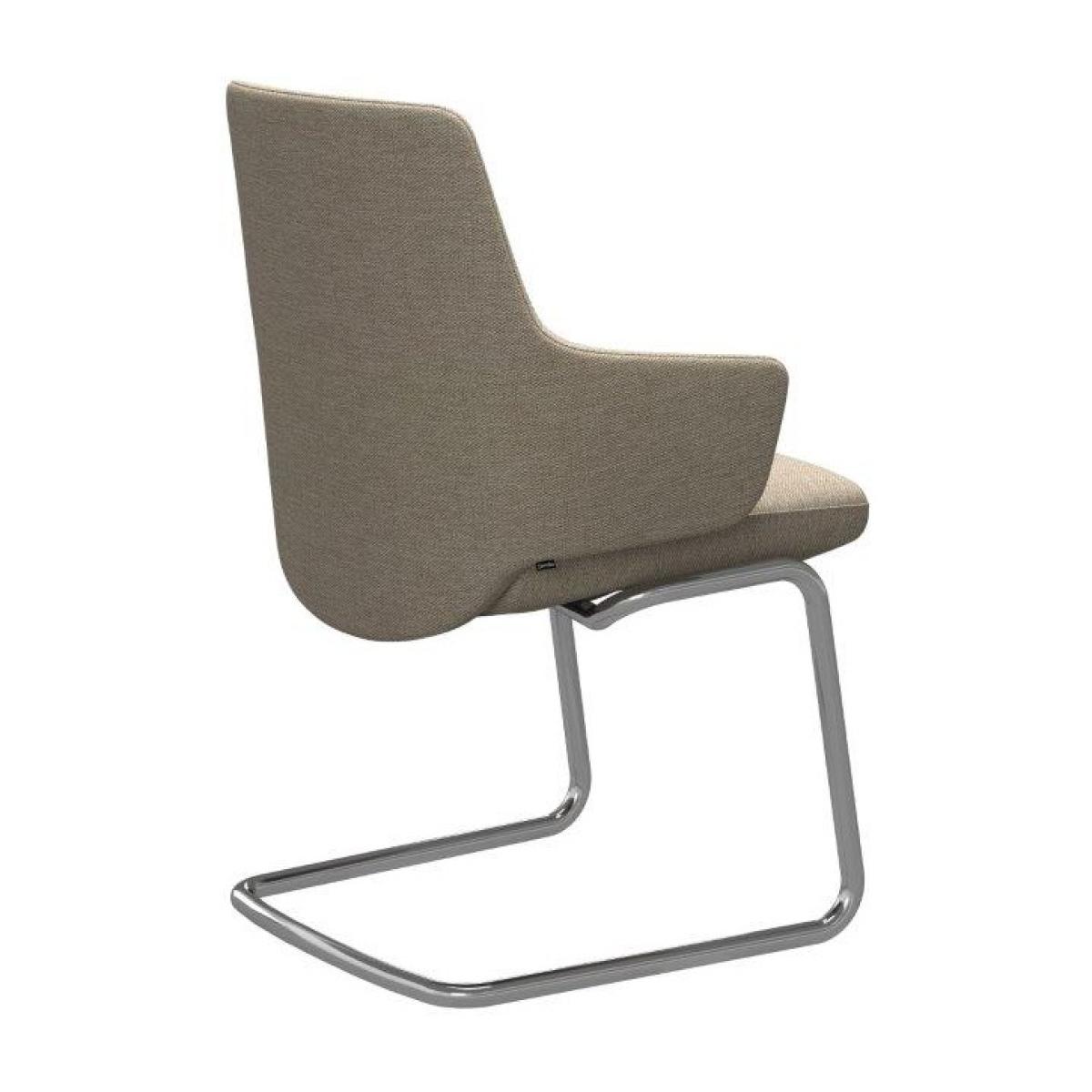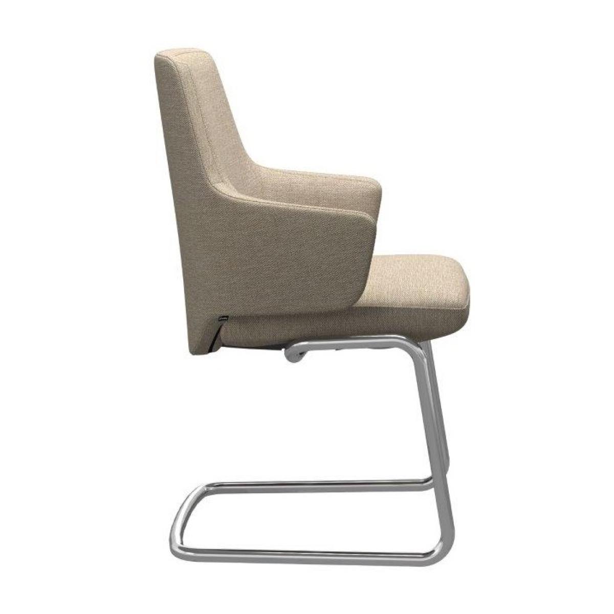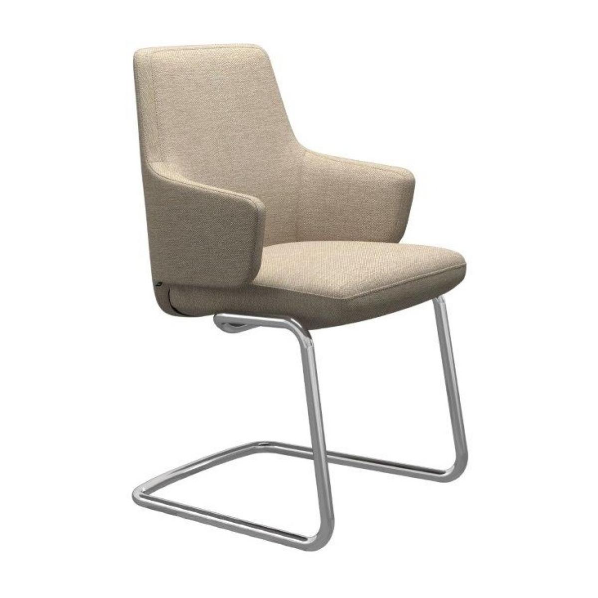 Experience true Stressless? comfort with Stressless? Vanilla. The dining chairs inviting design, with box edge cushioning and sidewalls that are accentuated by beautiful French seams, makes it perfect for enjoyable moments around the dining table. The innovative flexibility in the seat and back allows the dining chair to follow the slightest movement of the body. This way you can enjoy the meal even longer. Choose between high and low back, with or without armrests. Put your personal touch on your dining chairs by designing them just the way you want. Choose from the Stressless? range of materials, colours and all our Dining leg types in wood or metal. Upholstered in a choice of leather or fabric Shown here in Daisy Beige fabric with Chrome finish metal base Curved base in steel Large Chair Dimensions - W 58cm x D 62cm x H 92cm Seat Height 48cm x Seat Depth 45cm All screens vary in colour reproduction and whilst every effort has been made to display the colour as accurately as possible it is for guidance only.