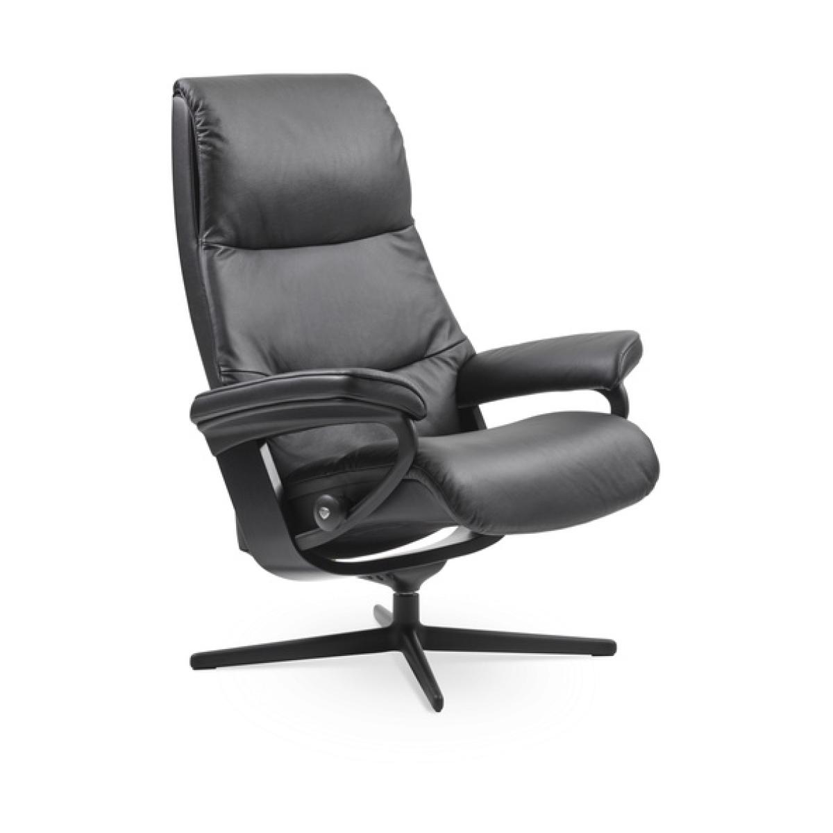 Please note that this product does NOT come with the footstool included A sleek and refined silhouette with clean lines. Experience the padded, elongated back of the Stressless View Recliner Chair and sink into a comfortable reclining position. Swivel with a full 360 rotation, you can change your direction with ease. Stressless® Plus™ this innovative system automatically adjusts the headrest as you recline, giving you uninterrupted eye-line support whether you're watching TV or reading. Sleep Function transforms the headrest so that it because comfortably flat for you to take that much needed power nap. Stressless® glide system perfectly adapts to your body as soon as you take a seat. You won't feel the chair working against you like with other recliners. Technical Specification Footstool not included Small w/Cross Base: h:108.0cm d:78.0cm w:78.0cm (Seat Height: 42.0cm) Medium w/Cross Base: h:109.0cm d:81.0cm w:82.0cm (Seat Height: 42.0cm) Large w/Cross Base: h:110.0cm d:85.0cm w:91.0cm (Seat Height: 46.0cm) Reclining and 360° swivel action 10 Year Guarantee on fabrication faults on internal mechanism Available in a wide range of different leather and fabric colours Patented Stressless Glide® technology moves with you and supports you in comfort