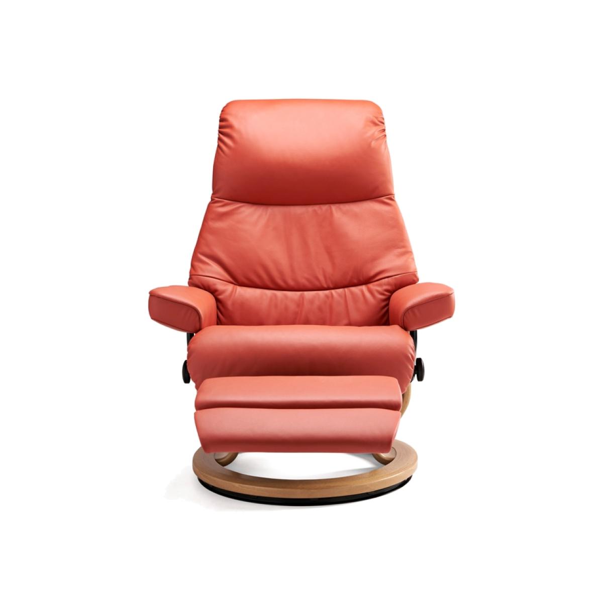 A timeless chair, the Stressless View Recliner Chair and Stool is just what you're looking for if you want a high quality, super soft and incredibly functional lounger. The timeless pillow design is extended through the longer, slim back of this chair, to give a more cushiony support for the lumbar and neck. Features: Stressless Leg Comfort - a comfortable footrest hidden underneath the seat that is revealed with a light touch of a button. The length can be adjusted to suit all heights. Swivel with a full 360rotation, you can change your direction with ease. Stressless Plus this innovative system automatically adjusts the headrest as you recline, giving you uninterrupted eye-line support whether you're watching TV or reading. Sleep Function transforms the headrest so that it because comfortably flat for you to take that much needed power nap. Stressless glide system perfectly adapts to your body as soon as you take a seat. You won't feel the chair working against you like with other recliners. Technical Specification 10 Year Guarantee on fabrication faults on internal mechanism Medium: h:109. d:77-134cm w:79cm (Seat Height: 46cm) Large: h:109cm d:82-134cm w:91cm (Seat Height: 47cm)