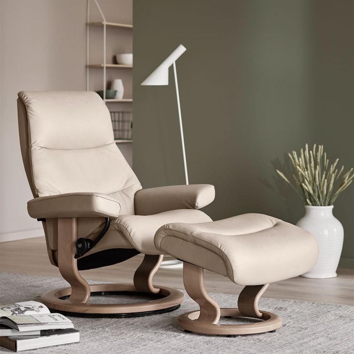 Stressless View Recliner With Classic Base and Footstool - Stressless Medium View Recliner With Classic Base Footstool in Fabric