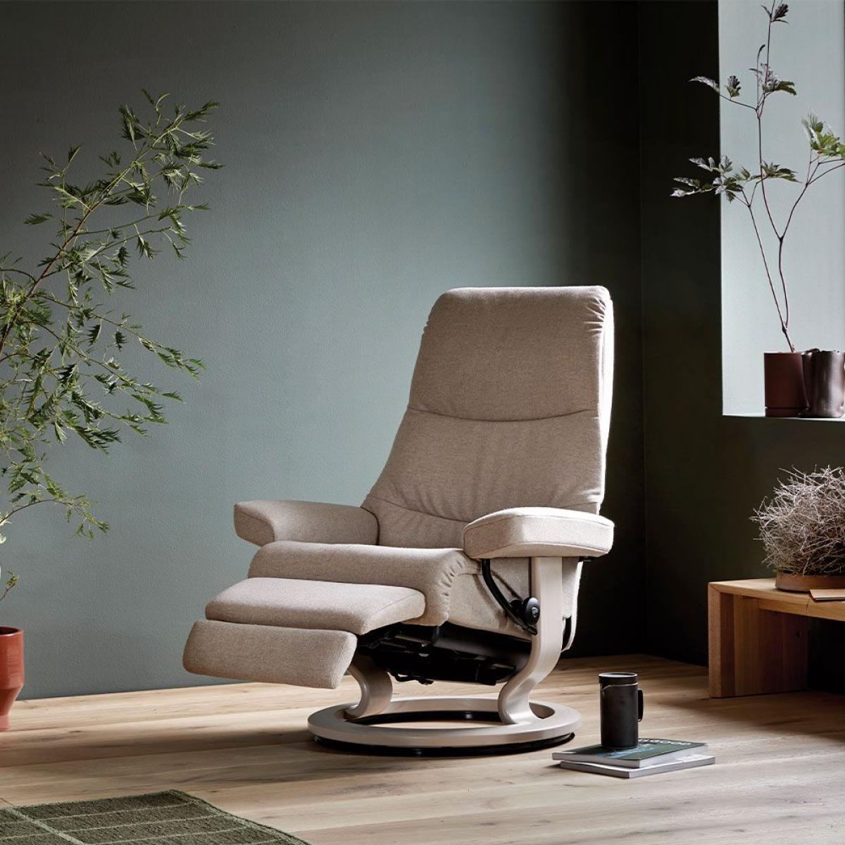 The. Stressless View chair. Has a timeless design that boasts a tall slim back especially suited to those that like to stretch out. Featuring a classic base that provides superb comfort. The footstool complements the comfort of the recliner with a built in glide movement to respond to your every move.