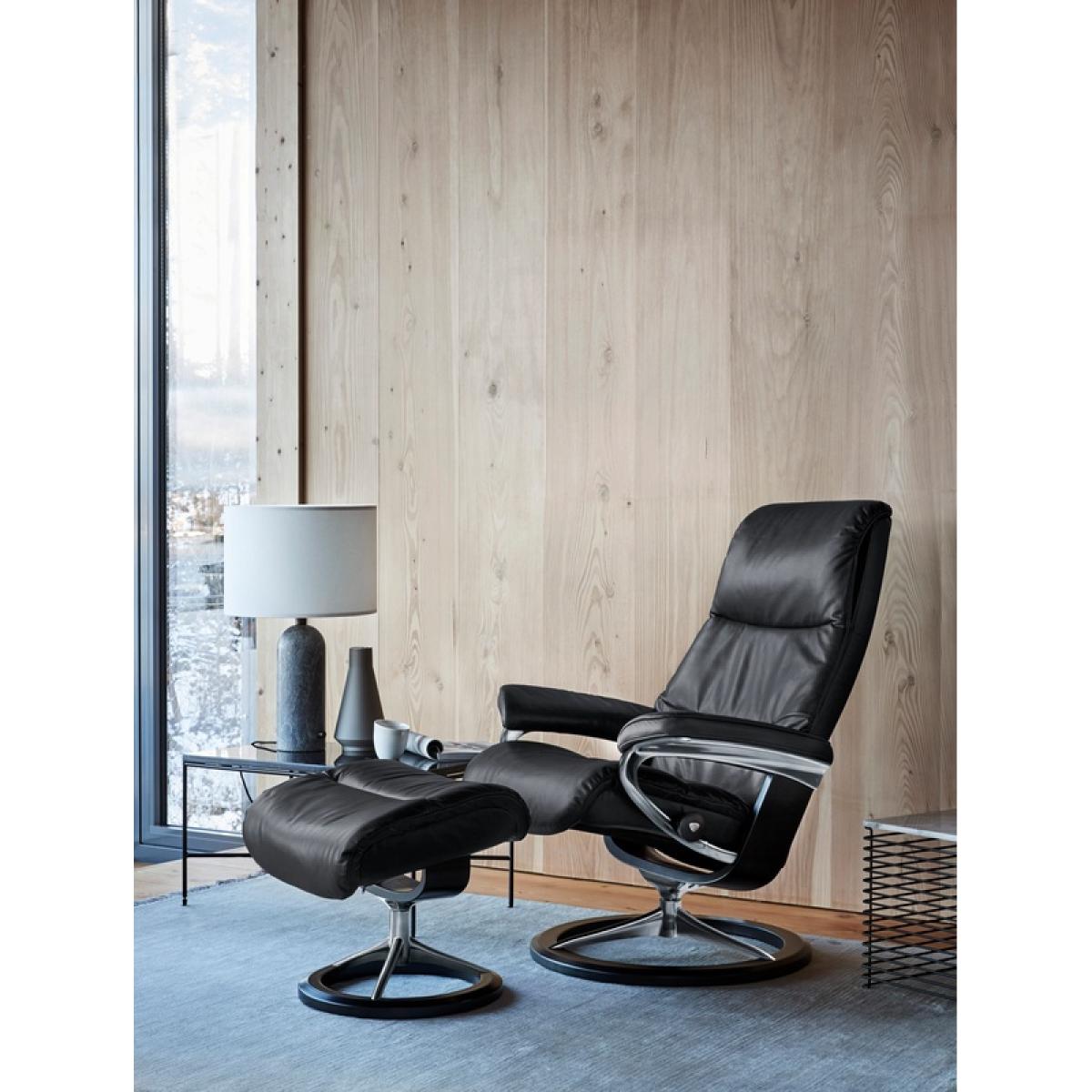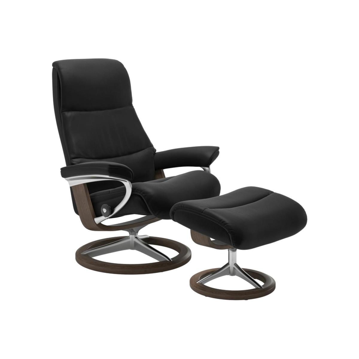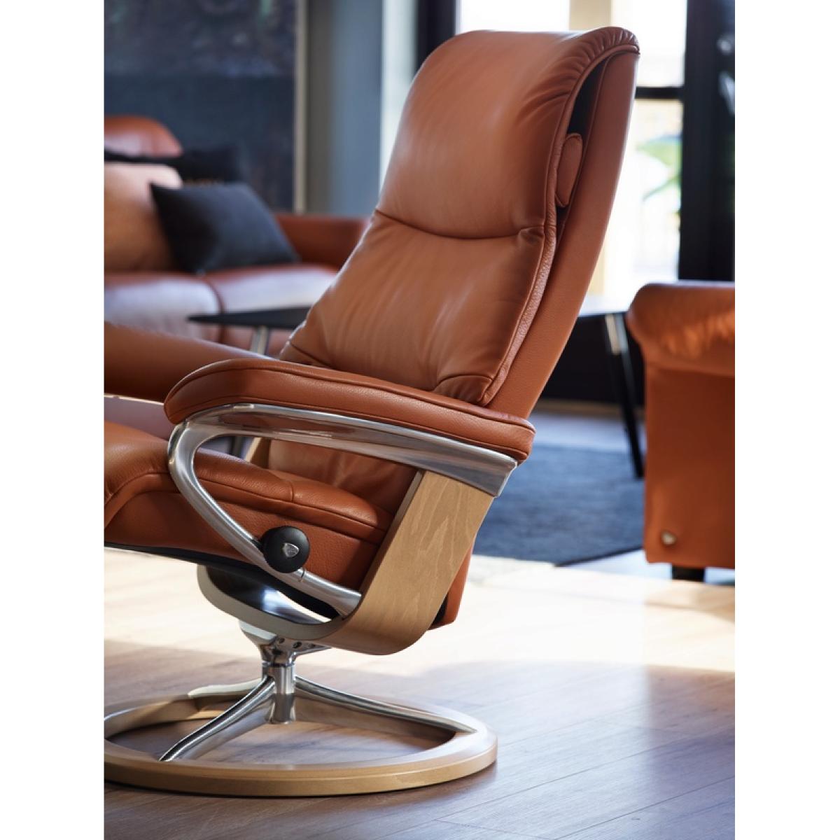 Please note that this product does NOT come with the footstool included A sleek and refined silhouette with clean lines. Experience the padded, elongated back of the Stressless View Recliner Chair and sink into a comfortable reclining position. Swivel with a full 360 rotation, you can change your direction with ease. Stressless® Plus™ this innovative system automatically adjusts the headrest as you recline, giving you uninterrupted eye-line support whether you're watching TV or reading. Sleep Function transforms the headrest so that it because comfortably flat for you to take that much needed power nap. Stressless® glide system perfectly adapts to your body as soon as you take a seat. You won't feel the chair working against you like with other recliners Technical Specification: Footstool not included Small w/Signature Base: h:108.0cm d:78.0cm w:78.0cm (Seat Height: 42.0cm) Medium w/Signature Base: h:109.0cm d:81.0cm w:82.0cm (Seat Height: 42.0cm) Large w/Signature Base: h:110.0cm d:85.0cm w:91.0cm (Seat Height: 46.0cm) Reclining and 360° swivel action 10 Year Guarantee on fabrication faults on internal mechanism Available in a wide range of different leather and fabric colours Patented Stressless Glide® technology moves with you and supports you in comfort