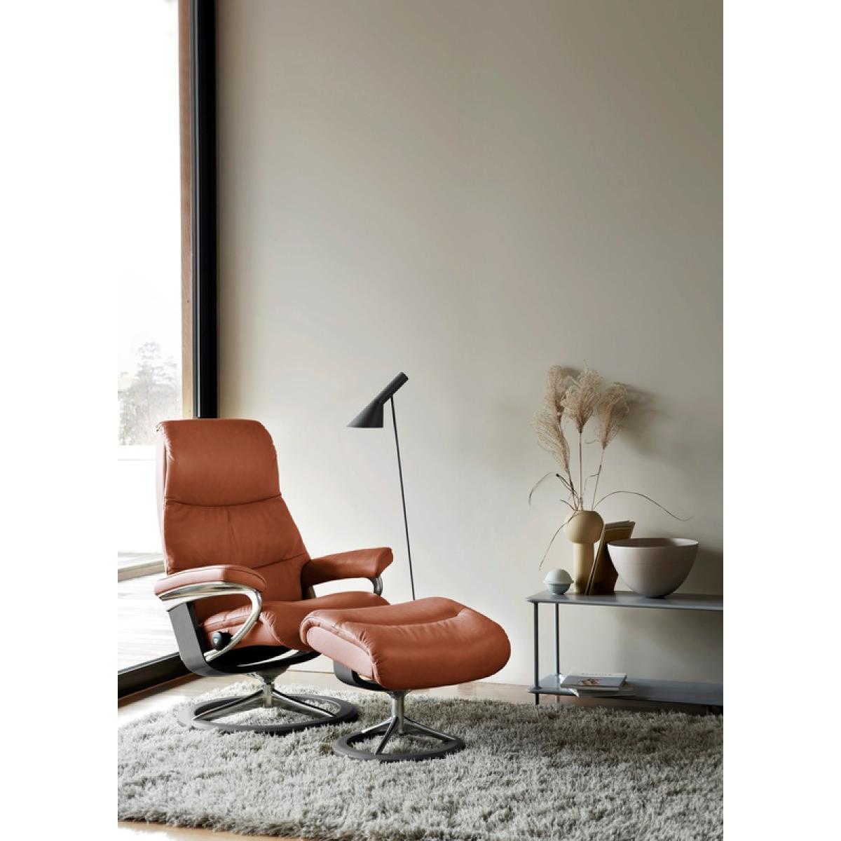 Please note that this product does NOT come with the footstool included A sleek and refined silhouette with clean lines. Experience the padded, elongated back of the Stressless View Recliner Chair and sink into a comfortable reclining position. Swivel with a full 360 rotation, you can change your direction with ease. Stressless® Plus™ this innovative system automatically adjusts the headrest as you recline, giving you uninterrupted eye-line support whether you're watching TV or reading. Sleep Function transforms the headrest so that it because comfortably flat for you to take that much needed power nap. Stressless® glide system perfectly adapts to your body as soon as you take a seat. You won't feel the chair working against you like with other recliners Technical Specification: Footstool not included Small w/Signature Base: h:108.0cm d:78.0cm w:78.0cm (Seat Height: 42.0cm) Medium w/Signature Base: h:109.0cm d:81.0cm w:82.0cm (Seat Height: 42.0cm) Large w/Signature Base: h:110.0cm d:85.0cm w:91.0cm (Seat Height: 46.0cm) Reclining and 360° swivel action 10 Year Guarantee on fabrication faults on internal mechanism Available in a wide range of different leather and fabric colours Patented Stressless Glide® technology moves with you and supports you in comfort