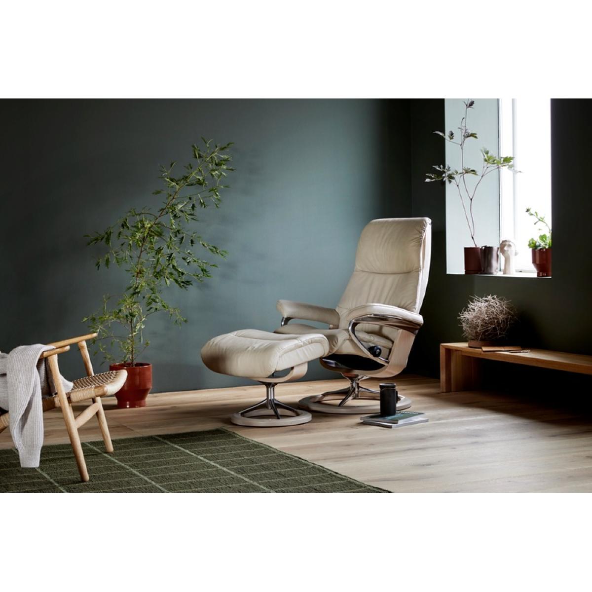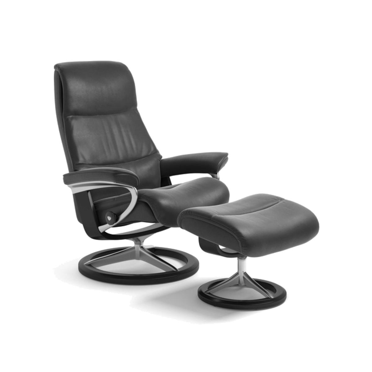 The perfect stool for the Stressless View recliner chair. The stool is like the recliner, elegant and cool, with the well-known Stressless features. 10-year guarantee on the internal mechanism Large choice of leathers and fabrics Choice of 6 wood finishes  Assembly required Footstool Dimensions (H x W x D): 43cm x 57cm x 47cm Please Note, the chair is not included in this price