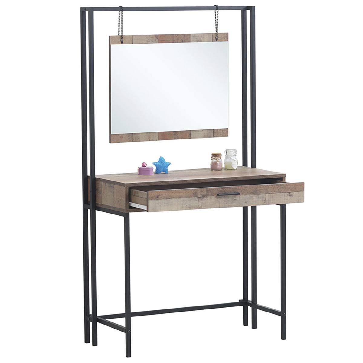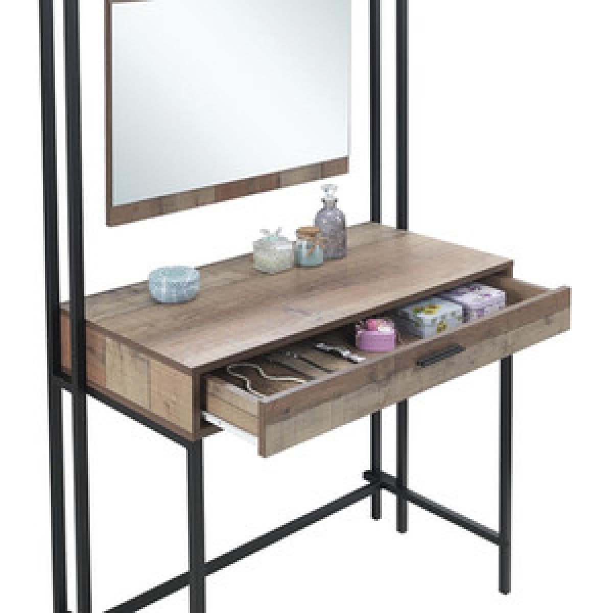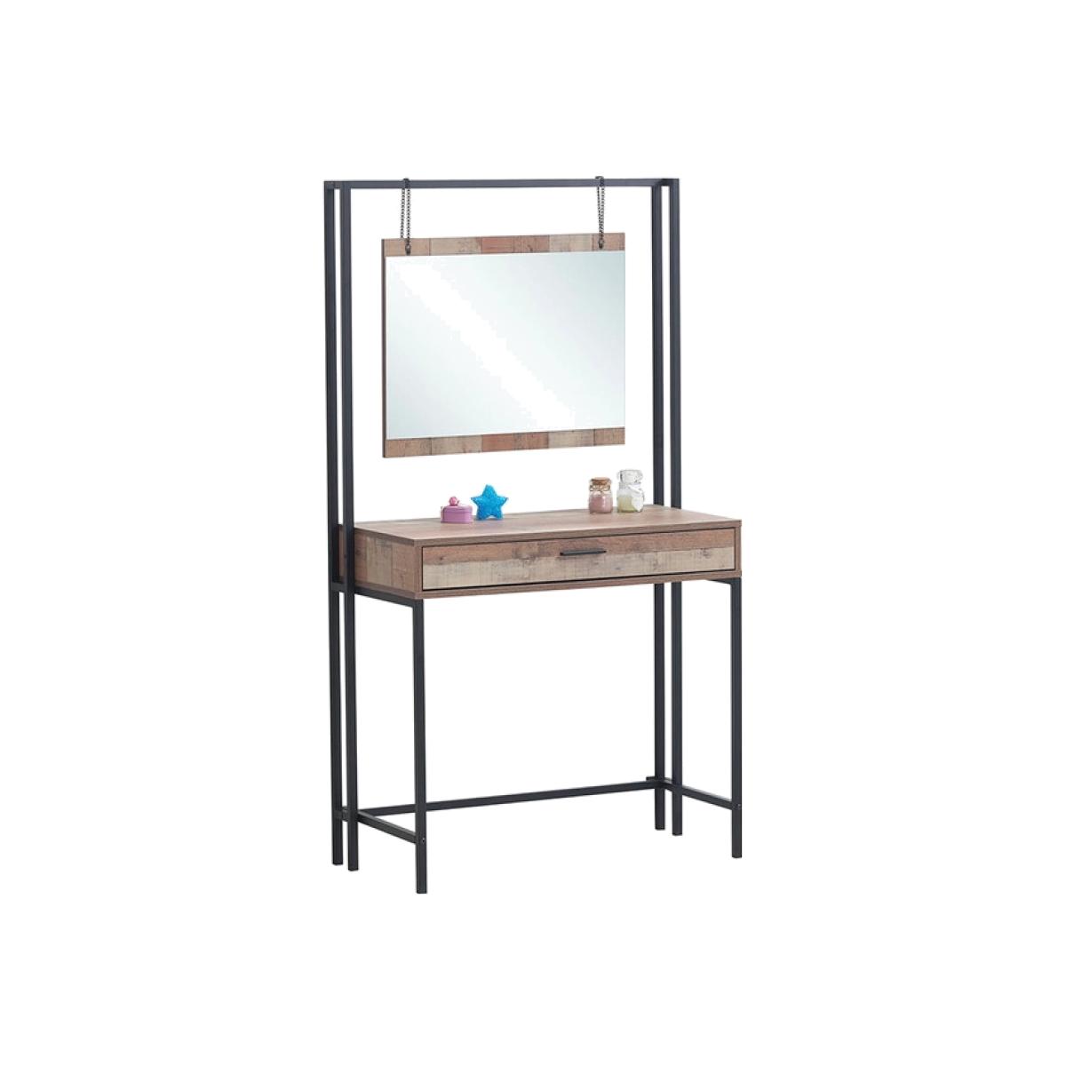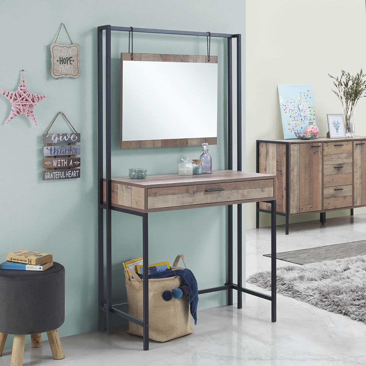 The Stretton Dressing Table delivers a striking rustic industrial combination of distressed-look oak effect panels. This beautifully designed Dressing Table comes complete with a dresser drawer and mirror that hangs from the top frame by rustic chains.