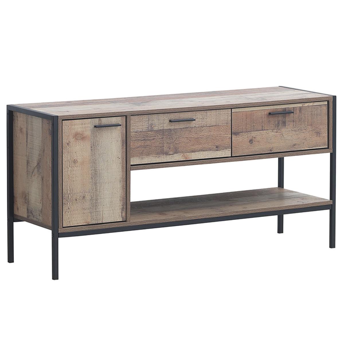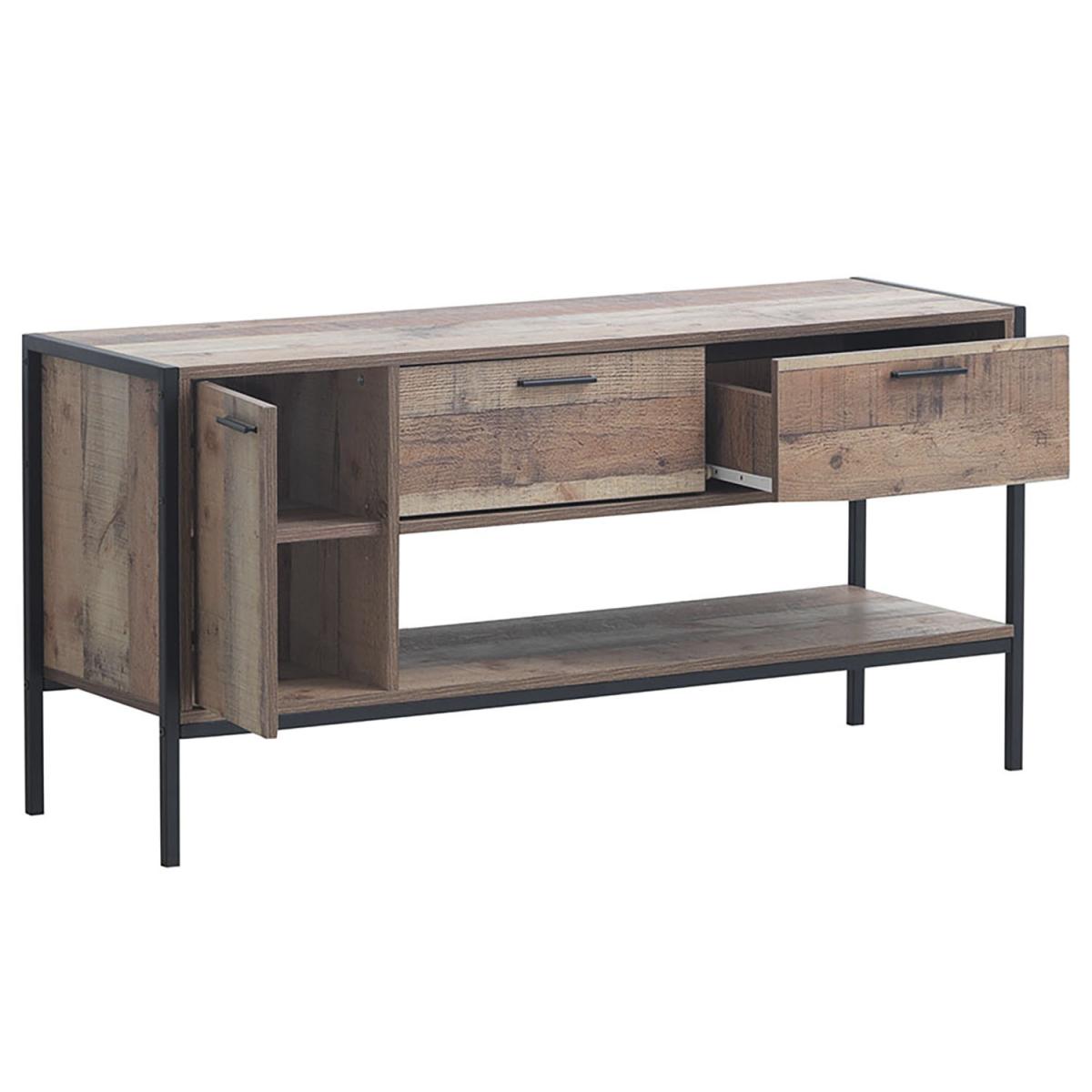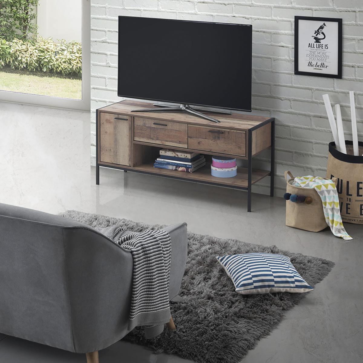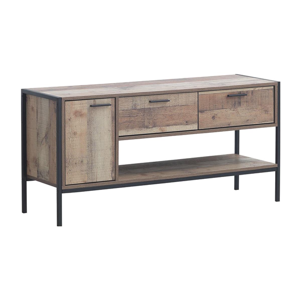 The Stretton furniture range delivers a striking rustic industrial combination of distressed-look oak effect panels with a black metal outer frame. The Stretton furniture range features metal handles and drawer runners where needed and is perfect for adding a statement to any area of your home. Withtwohandy storage drawers, each with an internal space of W36cm D30cm. It also features a cupboard with an internal shelf and an open shelf W90cm for all your AV equipment.