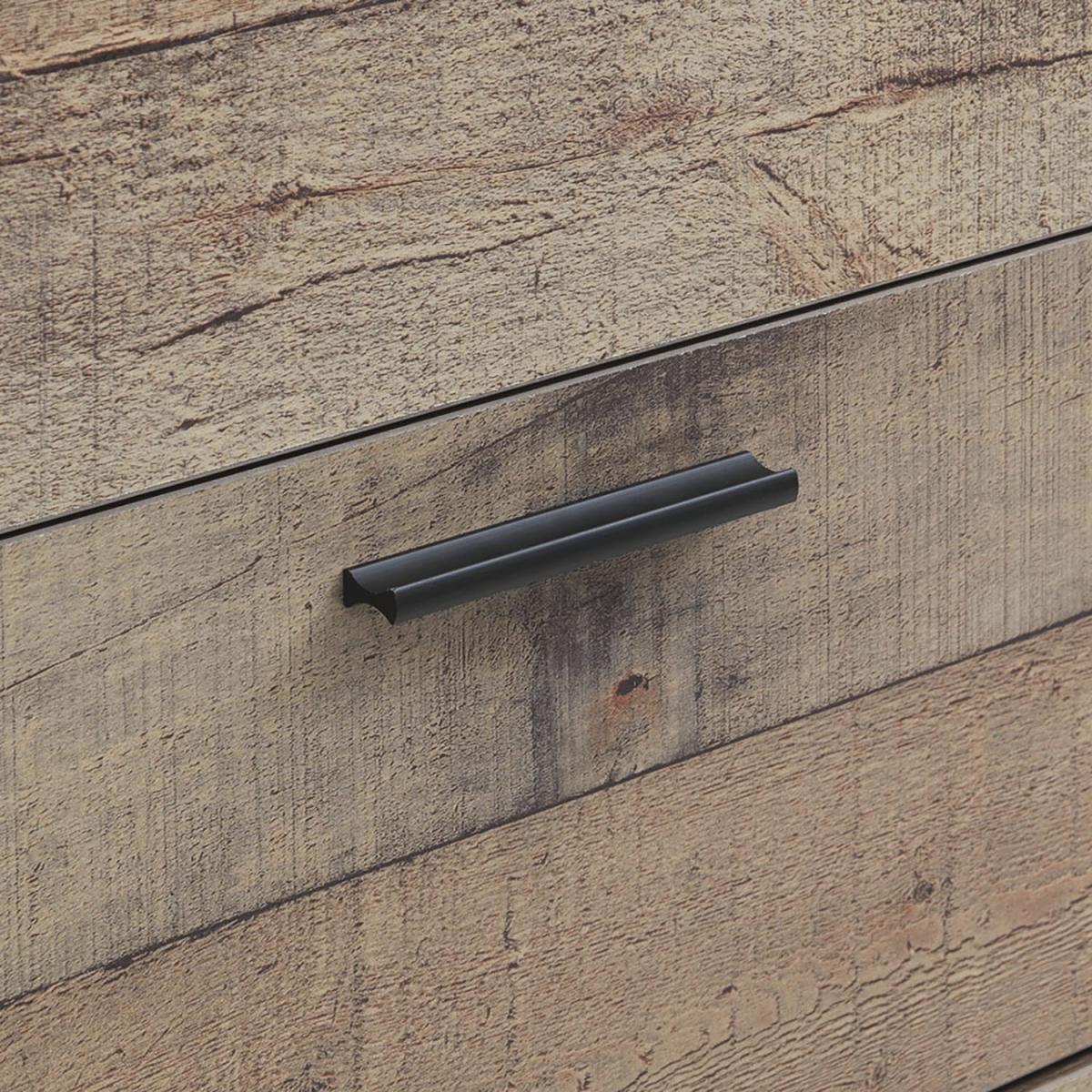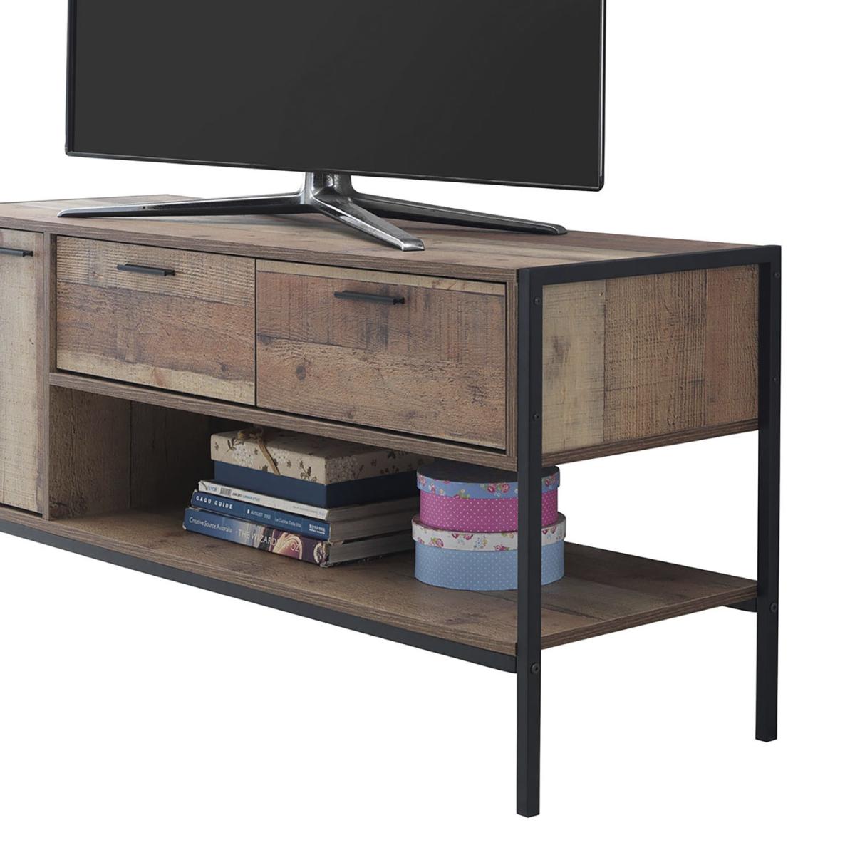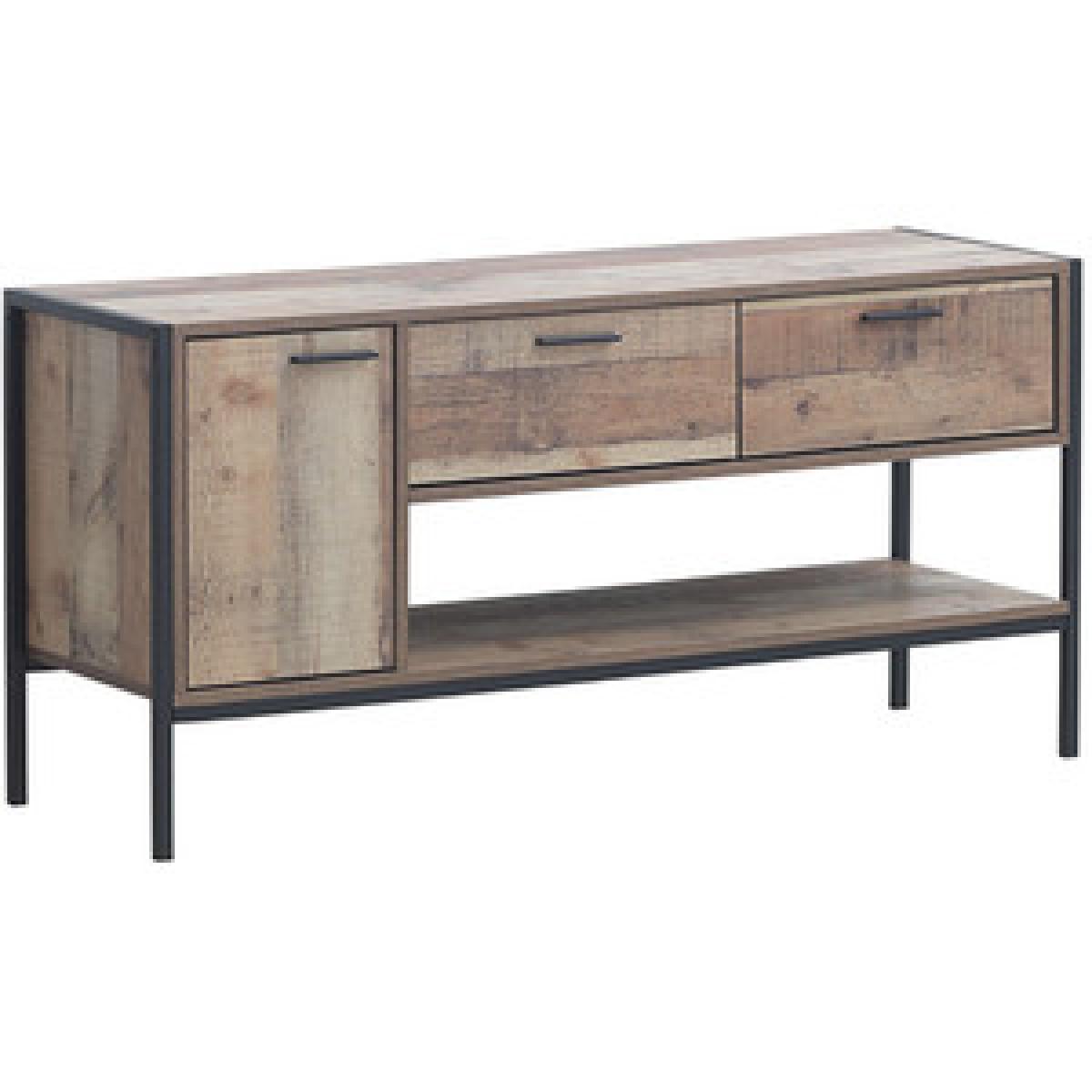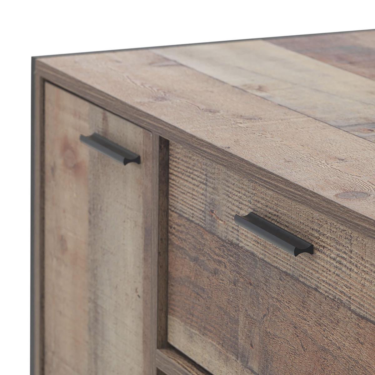 The Stretton furniture range delivers a striking rustic industrial combination of distressed-look oak effect panels with a black metal outer frame. The Stretton furniture range features metal handles and drawer runners where needed and is perfect for adding a statement to any area of your home. Withtwohandy storage drawers, each with an internal space of W36cm D30cm. It also features a cupboard with an internal shelf and an open shelf W90cm for all your AV equipment.