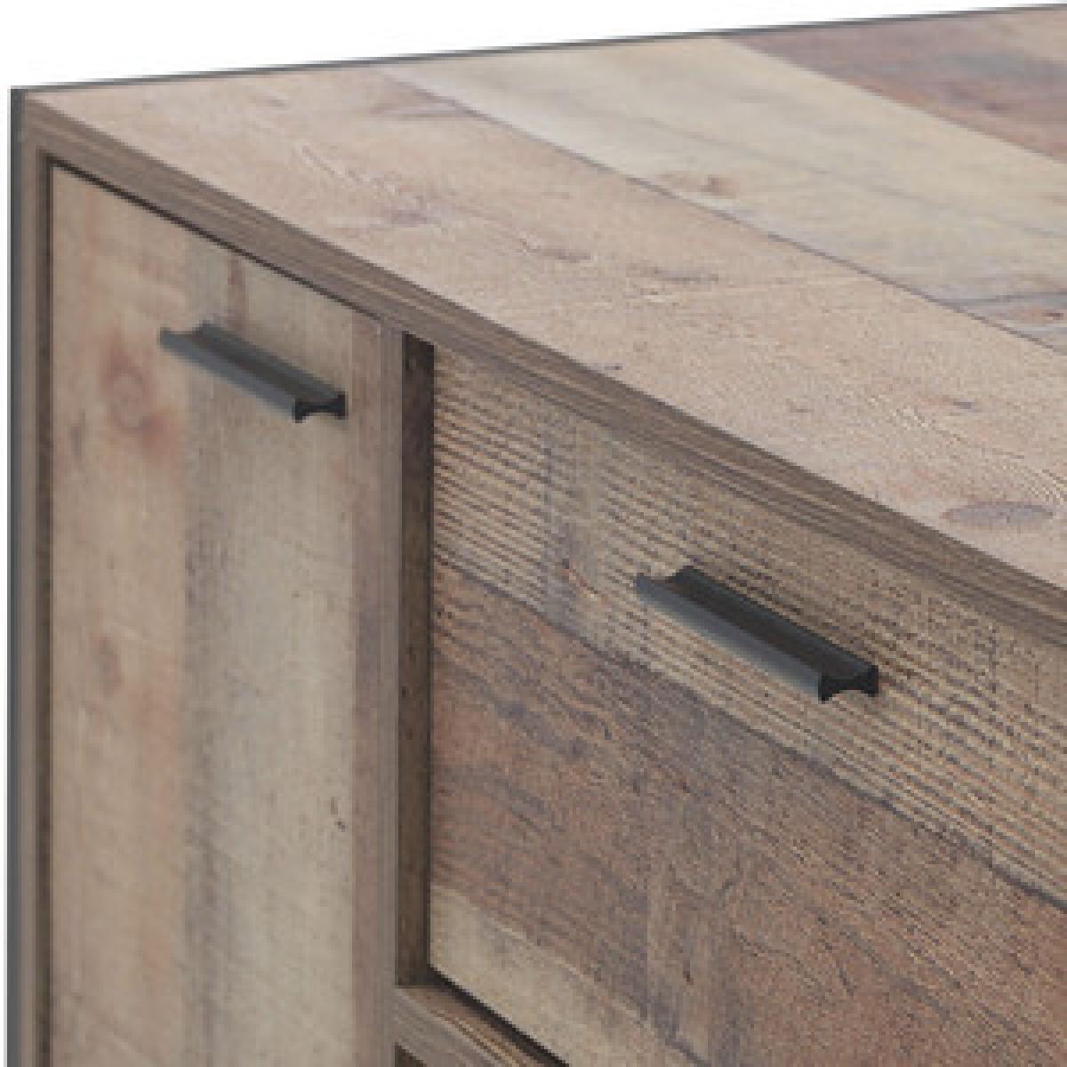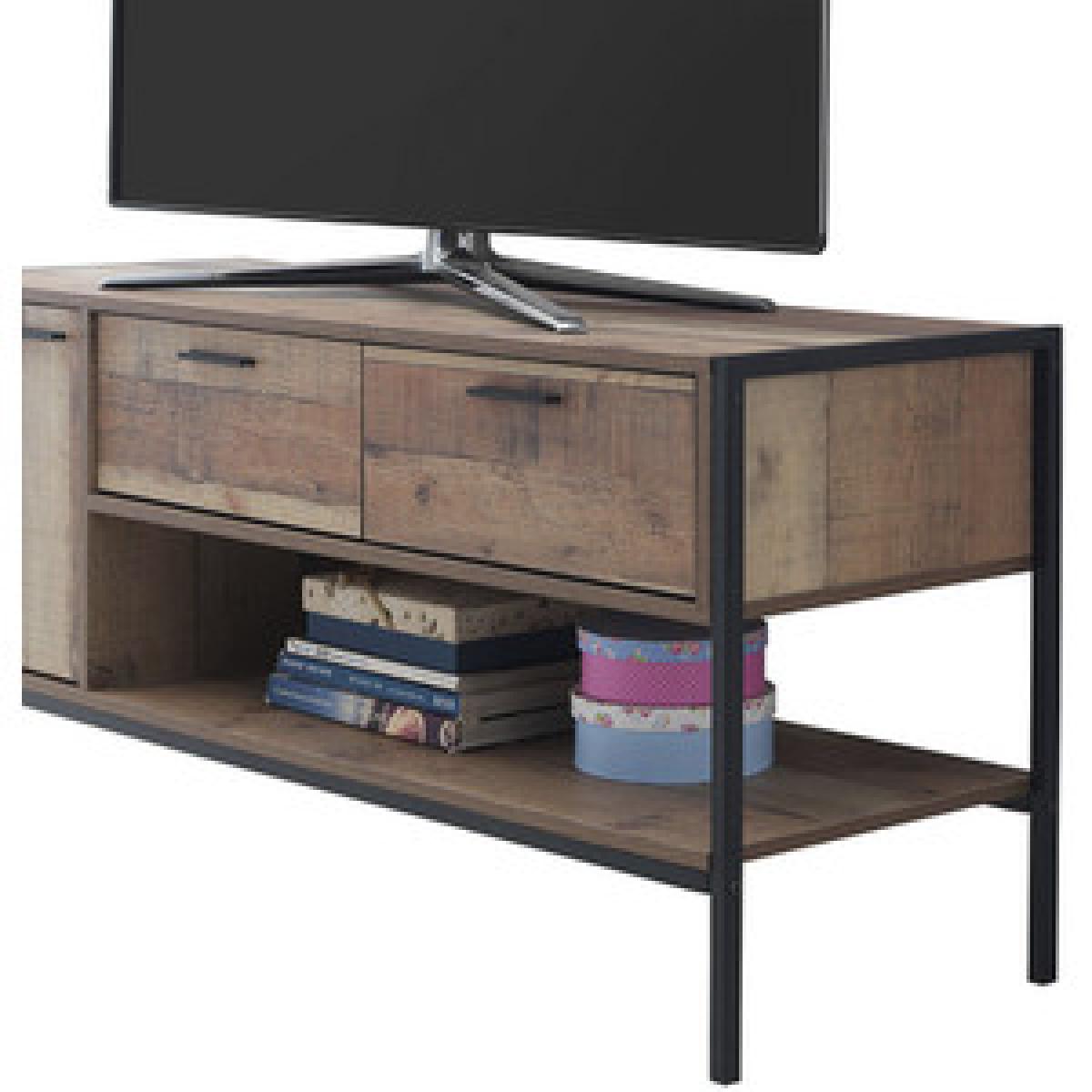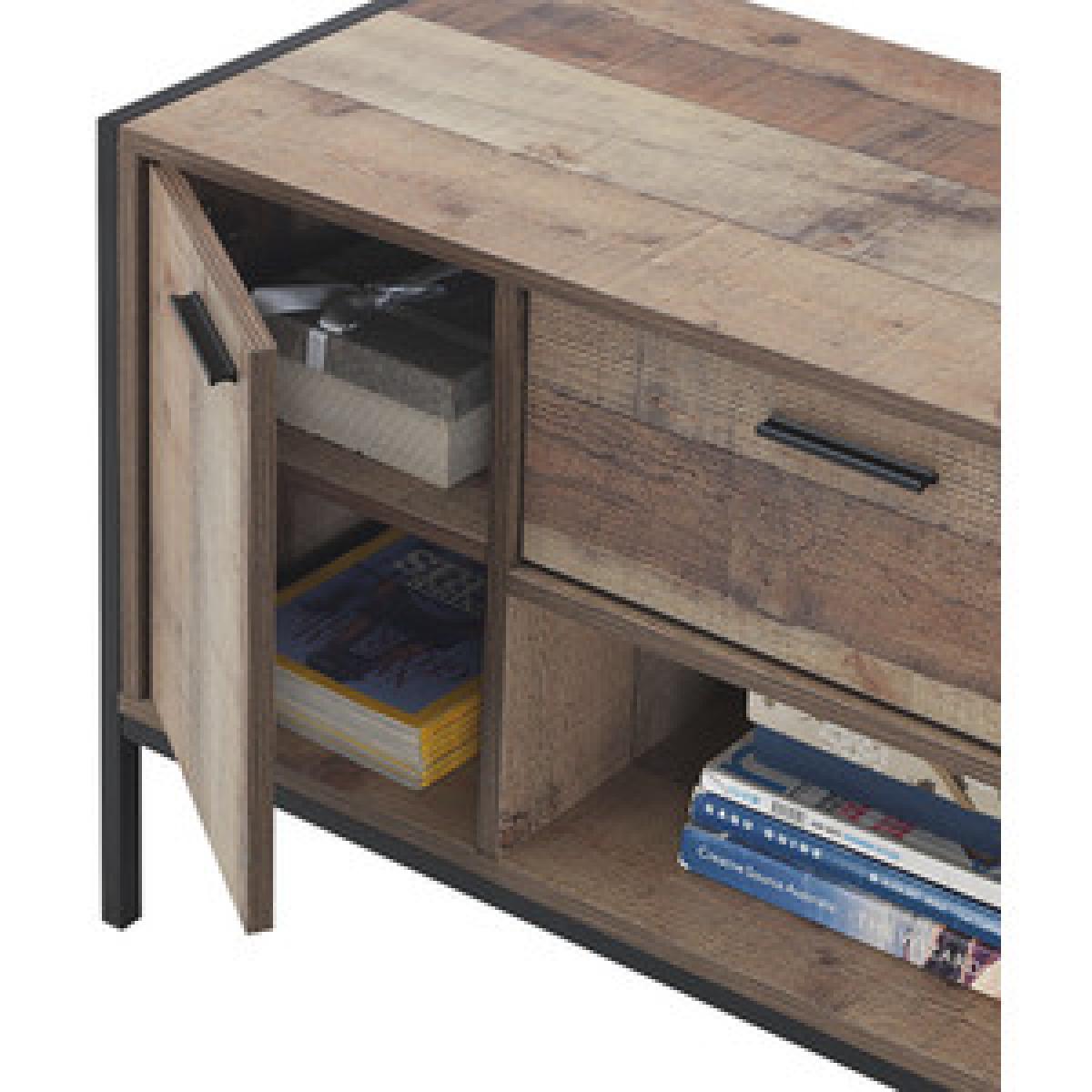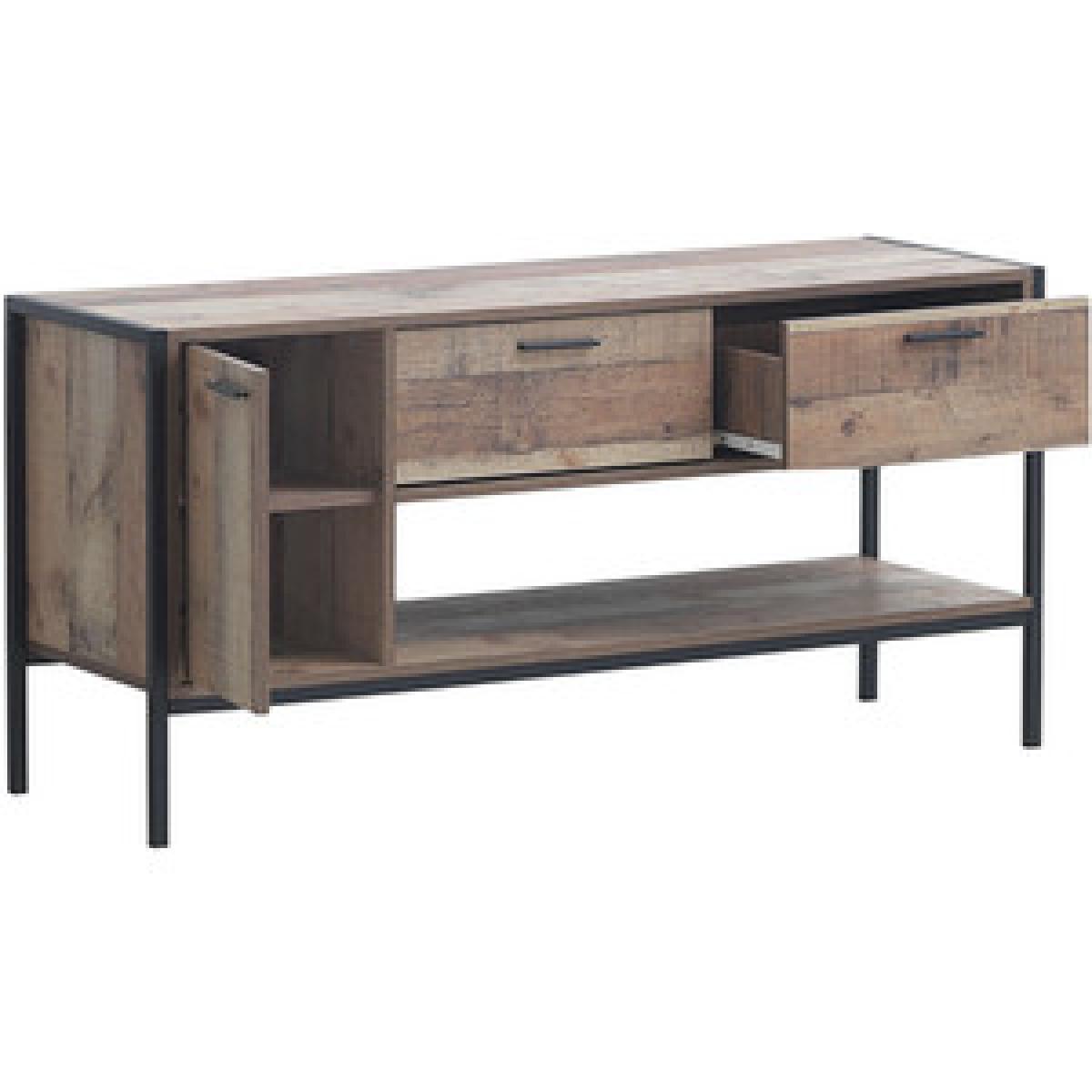 The Stretton furniture range delivers a striking rustic industrial combination of distressed-look oak effect panels with a black metal outer frame. The Stretton furniture range features metal handles and drawer runners where needed and is perfect for adding a statement to any area of your home. Withtwohandy storage drawers, each with an internal space of W36cm D30cm. It also features a cupboard with an internal shelf and an open shelf W90cm for all your AV equipment.