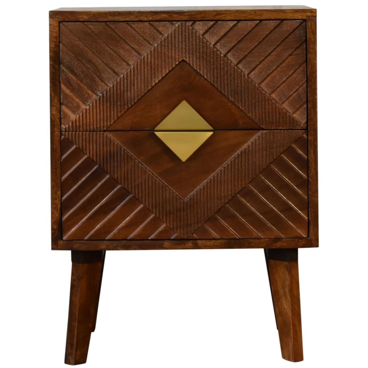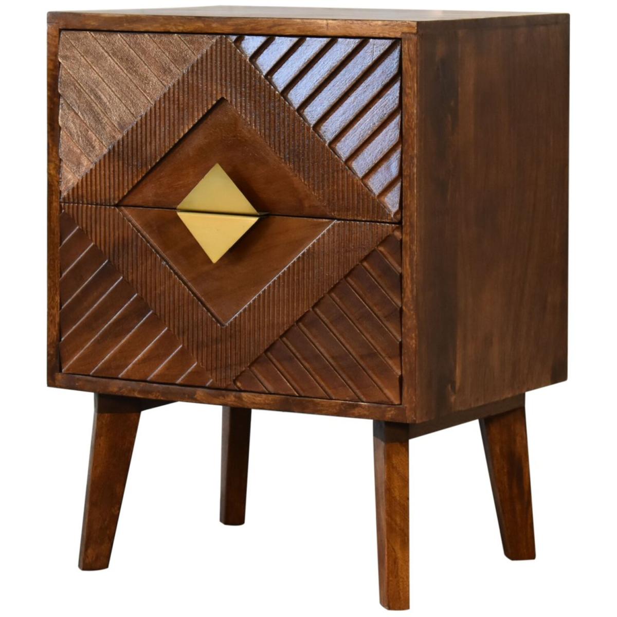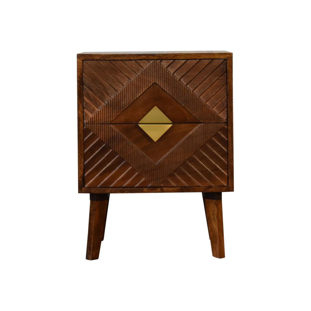 This striking bedside has been crafted from solid mango wood with a mid-century modern-style chestnut finish. It offers a striking ridged design surrounded by a brass inlay diamond and features two large drawers and gently flared Nordic-style legs. Pop a table lamp, plant or photo frame on top and enjoy your new, contemporary bedroom decor!