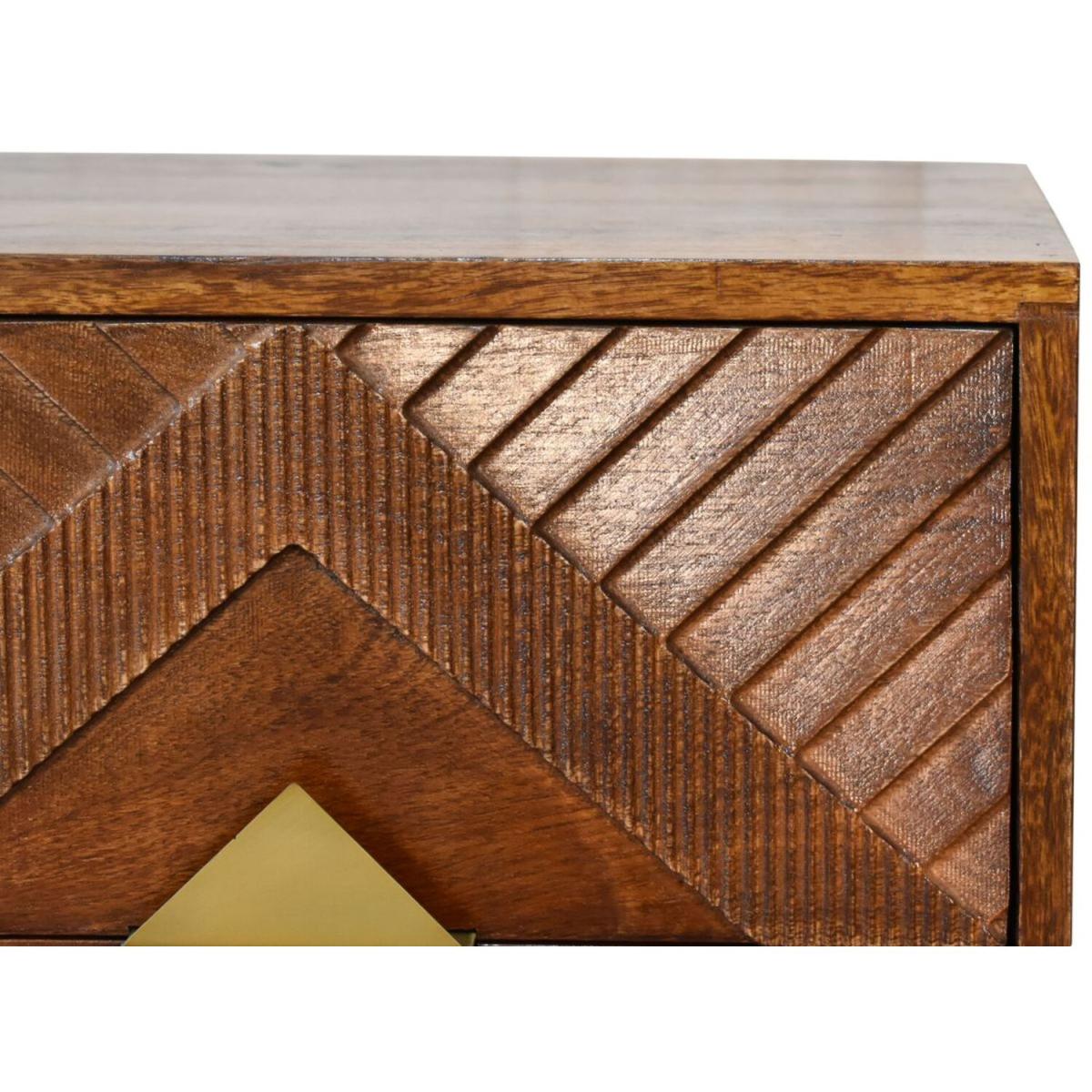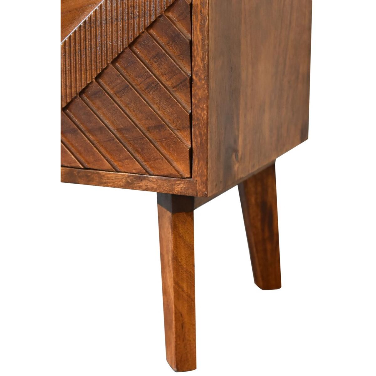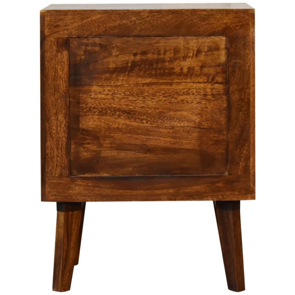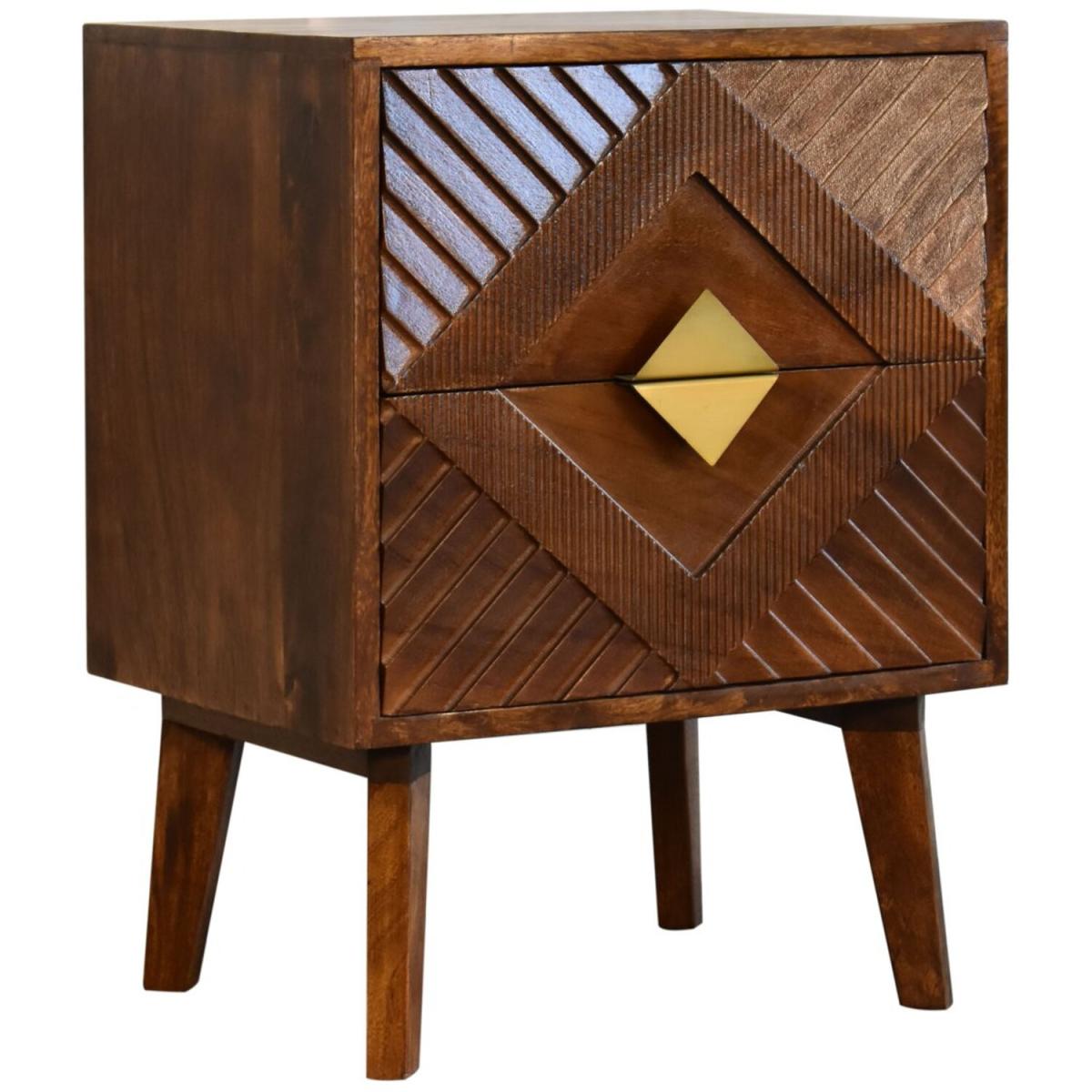 This striking bedside has been crafted from solid mango wood with a mid-century modern-style chestnut finish. It offers a striking ridged design surrounded by a brass inlay diamond and features two large drawers and gently flared Nordic-style legs. Pop a table lamp, plant or photo frame on top and enjoy your new, contemporary bedroom decor!