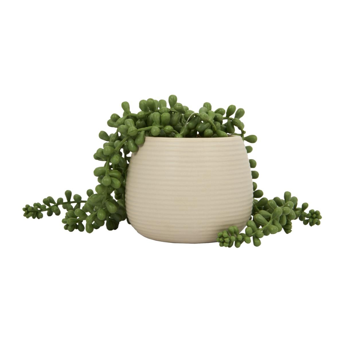 The String of Pearls in Ribbed Pot is perfect for any home decor. Inspired by a real String of Pearls trailing plant, this piece has a modern and detailed look that will coordinate beautifully in any space. The pearl effect leaves will hang gracefully over the edge of the pot and will look amazing on shelves, accent tables, and mantelpieces. It's finished with a ribbed pot in a neutral tone to fit seamlessly into your home design.