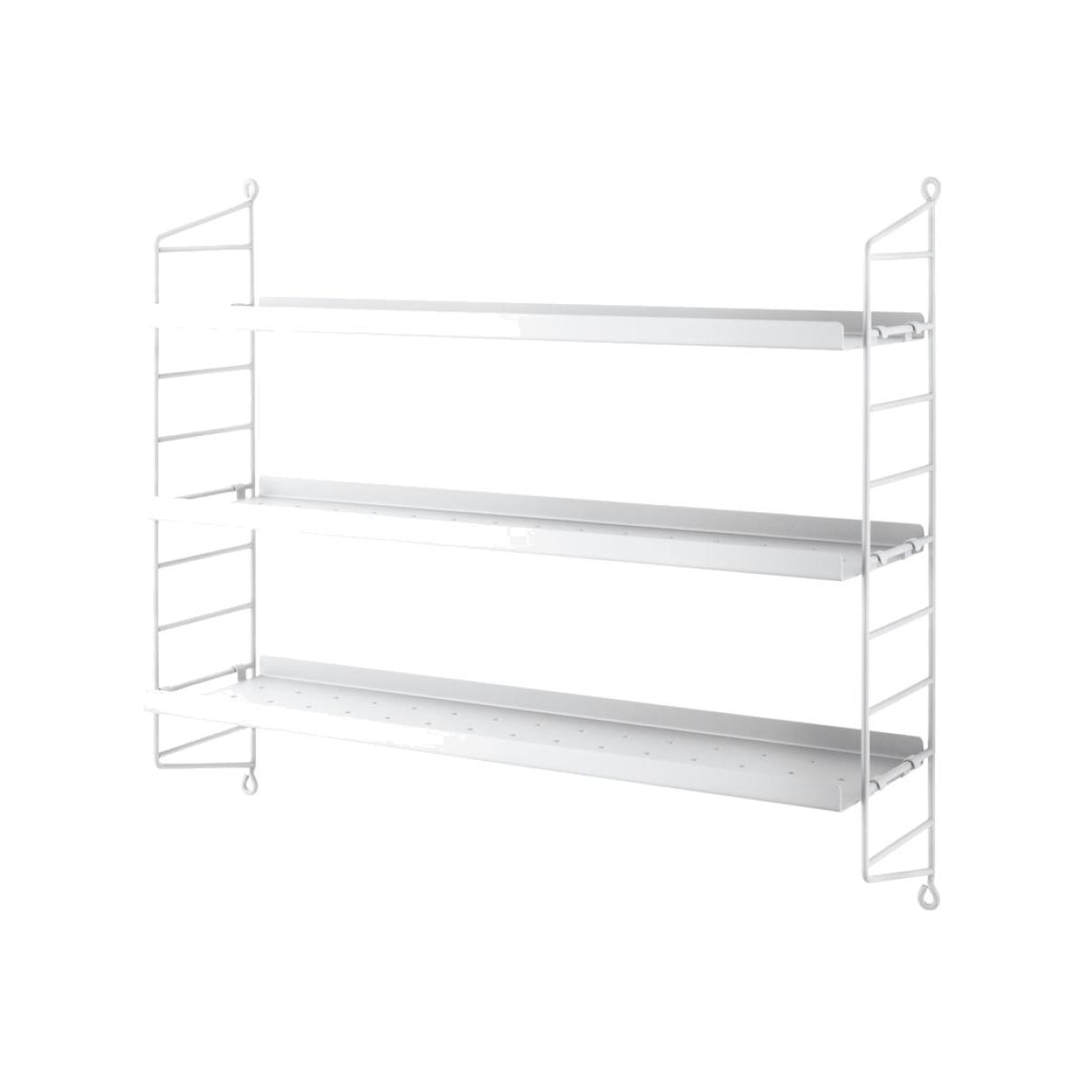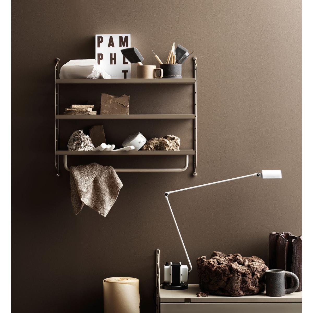 A Scandinavian design icon! The String shelving system was designed in 1949 by Swedish architect Nils Strinning (1917-2006), a leading figure in Scandinavian design. String is a system of modular shelves that can be combined depending on your needs. It is light, adaptable and offers a minimalist, timeless design, all of which have made it a Swedish design classic. The String shelf is still manufactured in Sweden in line with high quality standards. Its design has not changed since 1949. The String Pocket wall shelf can be fully disassembled. It consists of two brackets made of metal wire into which three height-adjustable shelves are fitted. Compact and convenient, you can position it anywhere, kitchens, entrances, bathrooms, bedrooms or living rooms. You can create a graphic composition on your wall by combining several String shelves side by side, vertically or horizontally. The wide range of colours, from bold and vibrant shades to pastel tones, means that String shelves can complement all interior styles. In this String® Pocket version, the three shelves are made using lacquered perforated steel and have a 2 cm edging. The perforations mean that you can suspend hooks from them, to optimise storage space for your smaller tools and utensils.