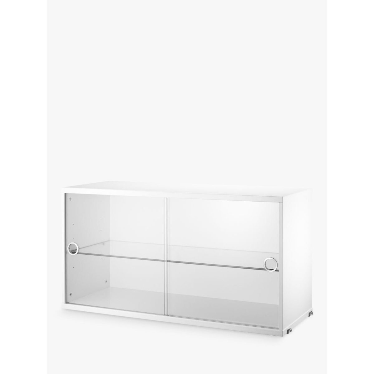 Nils Strinning’s string® shelf system was originally created in 1949, and is now considered a design classic thanks to its versatility and understated aesthetic. The selection of shelves, storage and desk sections can be combined to suit your precise needs, and can easily be expanded or reconfigured as your requirements change. This practical storage cabinet features a pair of glass sliding doors that open to reveal two sections and detachable shelves. The frames of the Oak and Walnut colour options are crafted from veneer chipboard, while the white option is made from lacquered MDF. The handles are stainless steel. Assembling your string system. The string system features a range of cabinet, drawers, shelf and desk sections that are fastened to side panels. Side panels are attached to the wall and are available in single packs or in packs of 2. Always use a spirit level when installing shelf units. Do not use an electric screwdriver with string systems. Weight safety limits will vary between products, please read the installation documents with your product for more details. Floor fastening side racks allow a maximum skirting board height of 12.5cm. If your skirting board is higher than this then use a wall fastened side rack