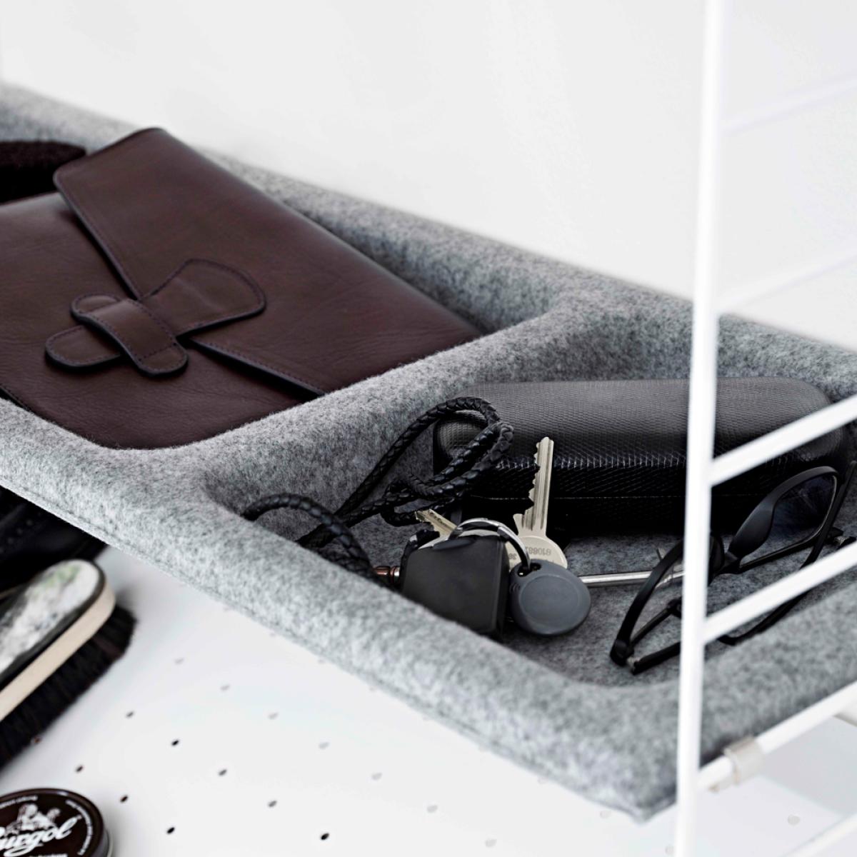 String bowl shelf in felt fits into all 30 cm deep wire and plex panels from String® System. With the small kitchen, bathroom and hallway in mind this product helps you store the most important things you want to have easily accessible in the room.