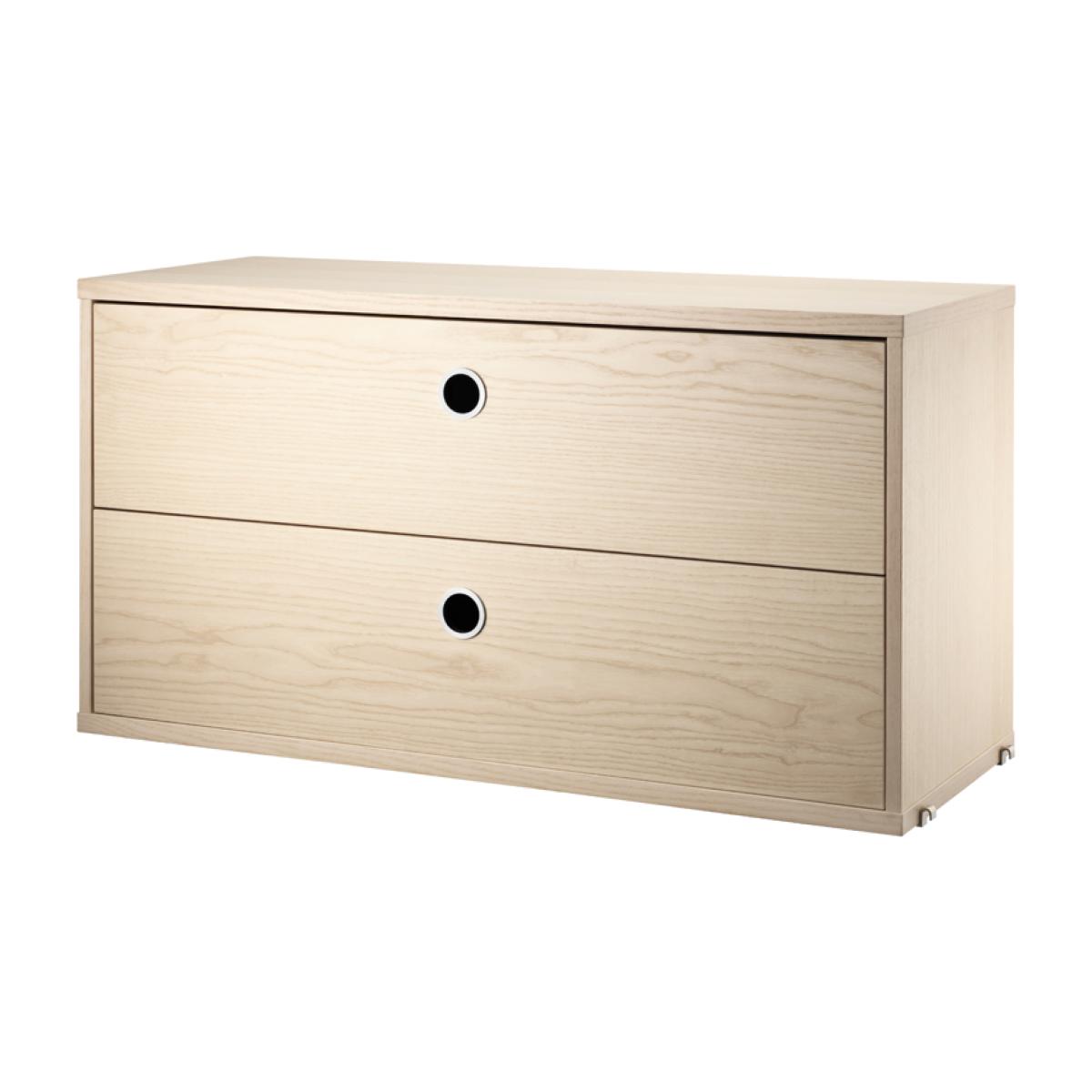 String cabinet with drawers is part of the functional and classic String shelf and is part of the String System series that includes components with classic wire panels and offers almost unlimited combinations. It has two drawers, fitted with the same round handles as the cabinet doors. The String drawer unit fits all String System wire and plex headboards with a depth of 30 cm.