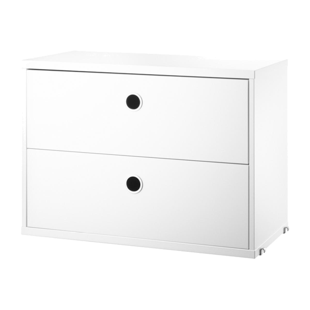 String cabinet with drawers is part of the functional and classic String shelf and is part of the String System series that includes components with classic wire panels and offers almost unlimited combinations. It has two drawers, fitted with the same round handles as the cabinet doors. The String drawer unit fits all String System wire and plex headboards with a depth of 30 cm.