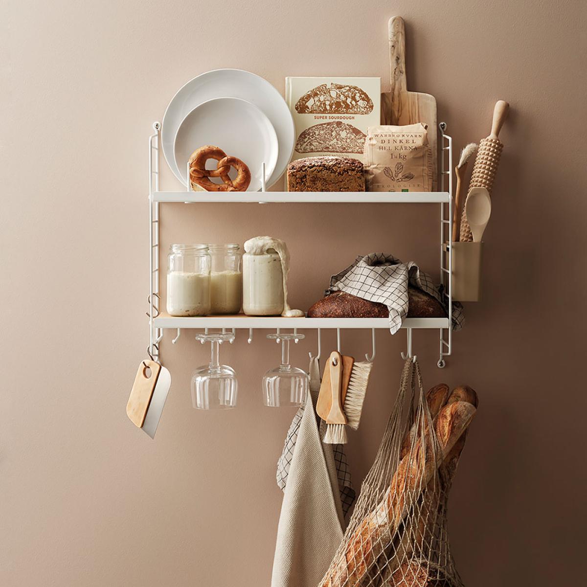 The String kitchen wall shelf is ideal when you are looking for stylish and practical storage solutions for the kitchen - especially in smaller spaces. The String shelf was designed by Nisse Strinning in 1949 and is a true design classic. This kitchen version comes with hangers so you can hang your wine glasses from the shelf but you could also add hooks - you decide.