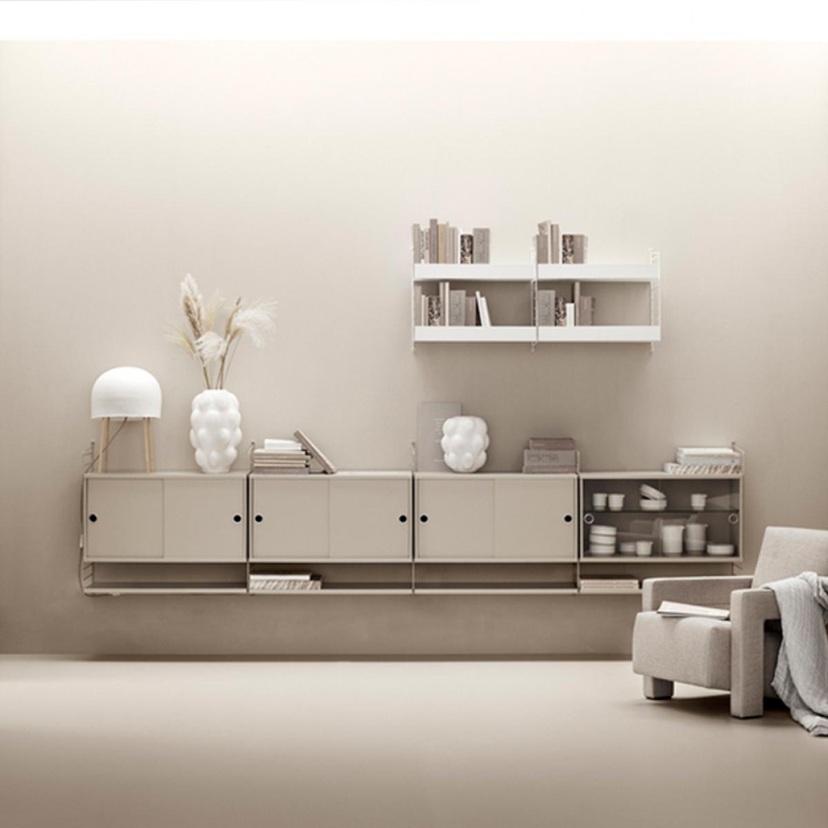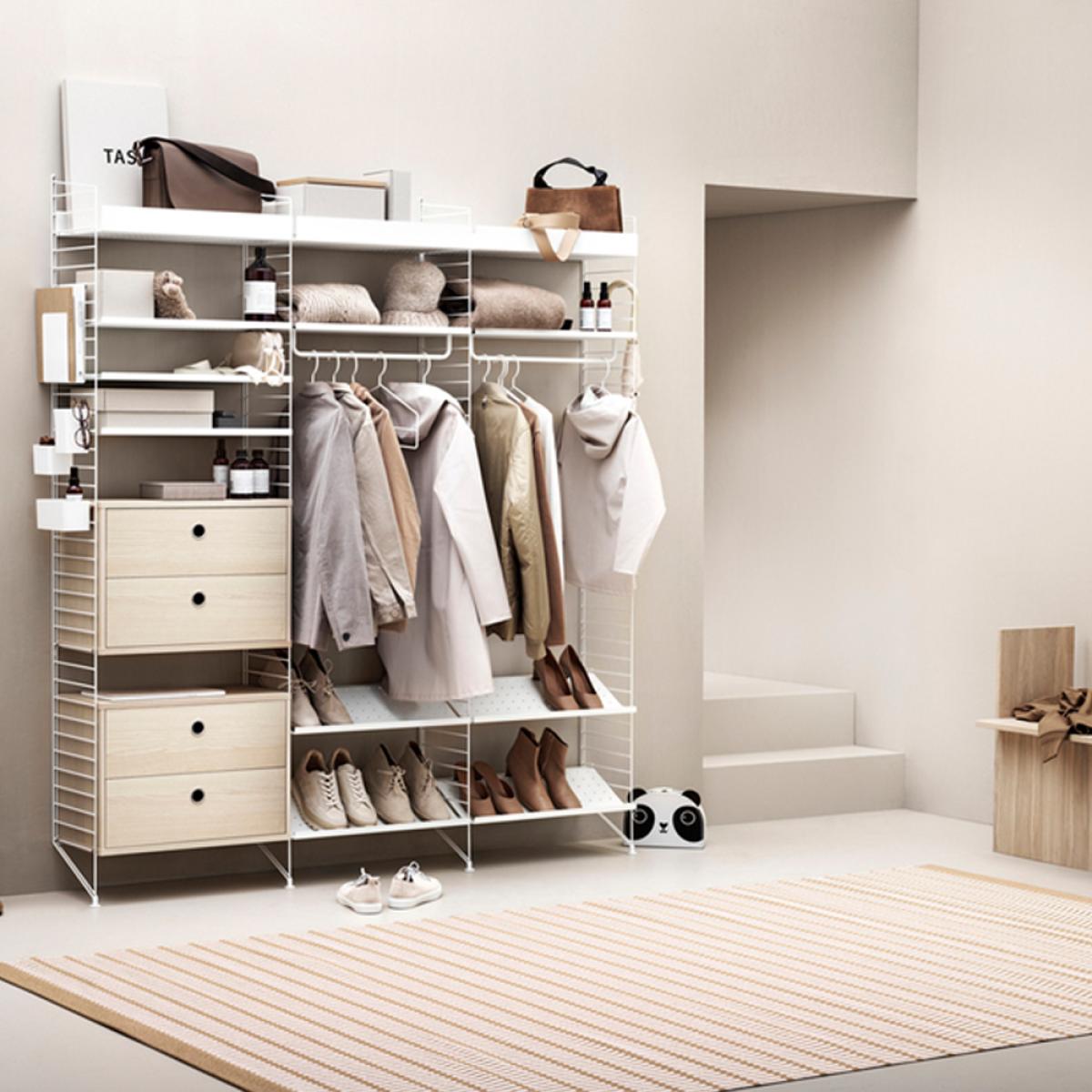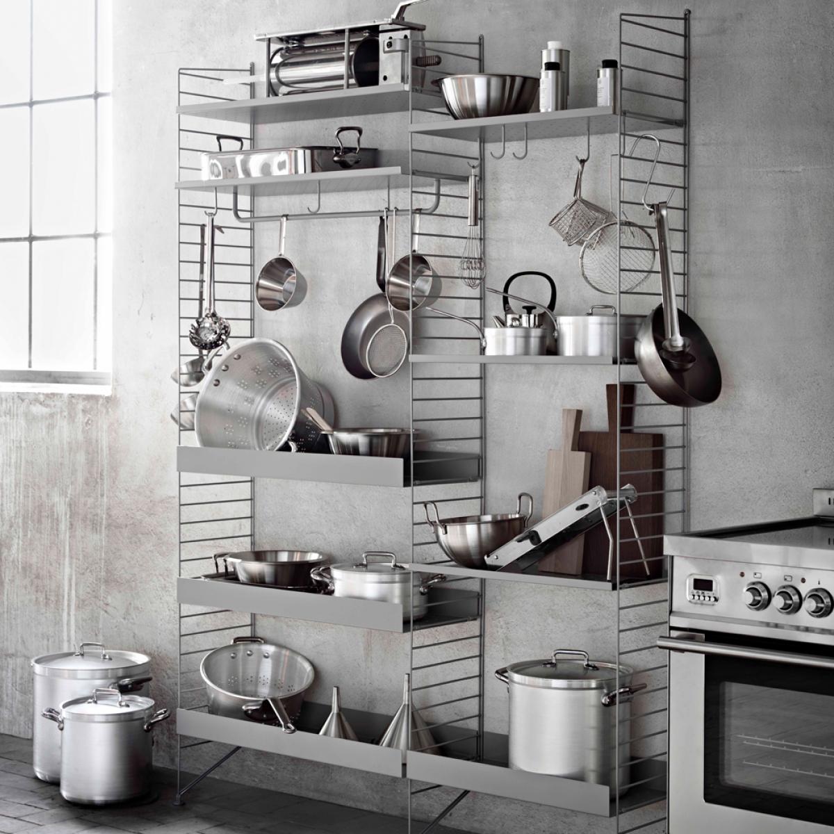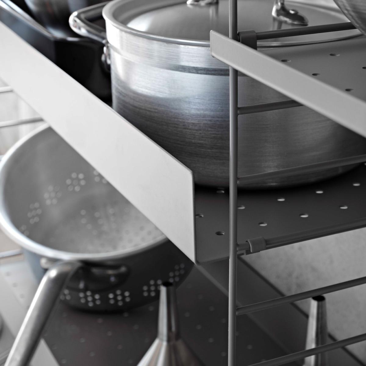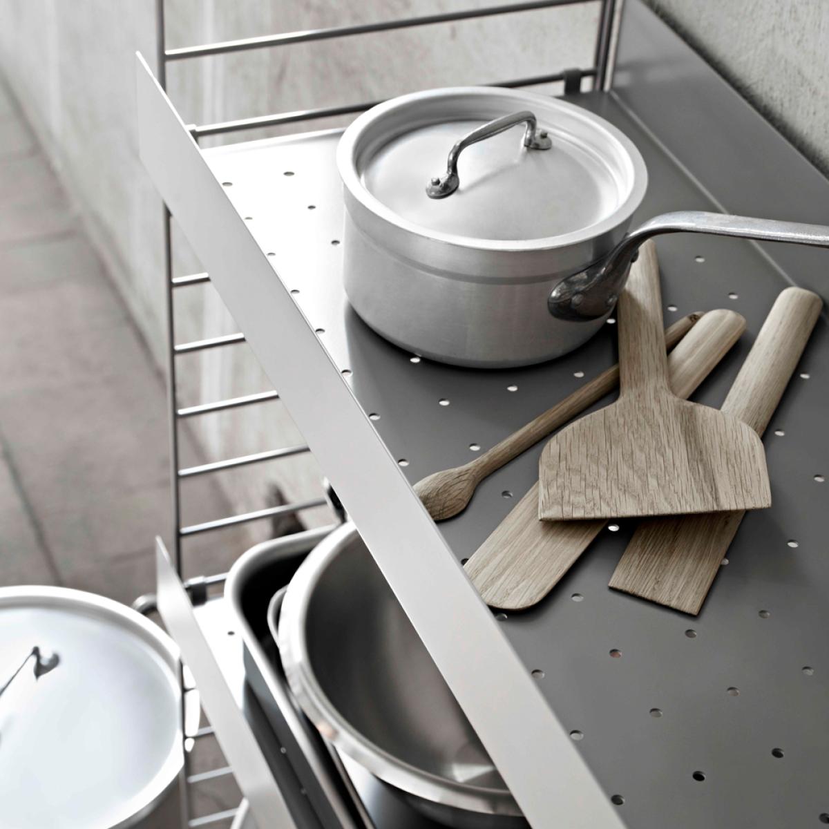 String metal shelf is made of lacquered metal and has a perforated surface which makes it particularly suitable for outdoor use or storage of kitchen equipment. The perforated shelves are the optimal base to be creative with our accessories. Add hooks, rods, or hanger racks to design your own unique shelf. The metal shelves are available in two widths, 58 and 78 cm, and two depths, 20 and 30 cm. You can also choose between low or high edge.