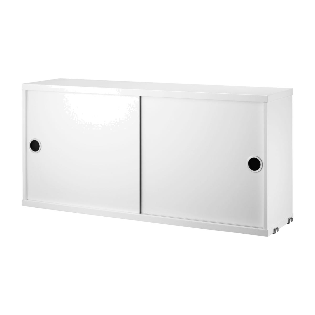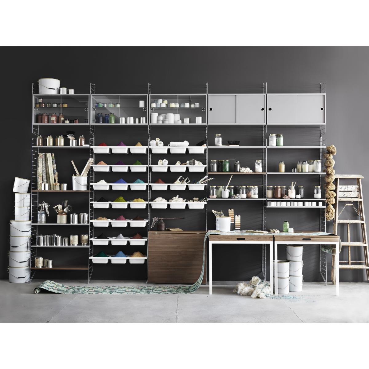 A Scandinavian design icon, the String shelving system was designed in 1949 by the famous Swedish architect Nils Strinning. Totally flexible, this shelving system gives you complete freedom to customise the look, dimensions and functions of your bookcase. All the elements (uprights, shelves, boxes etc) are sold separately and assemble easily. You choose the number of uprights, the number and length of shelves, you can add boxes. The String shelf is still made in Sweden with close attention to quality. Its design has not changed since 1949. As for building your String shelving, nothing could be easier! The shelves and boxes are freely arranged in the side uprights made of steel wire. You can choose between several types of shelves: simple shelf (L 58 cm or L 78 cm), magazine holder shelf (L 78 cm) or shelf with 3 built-in boxes (L 78 cm). You can also choose a box with sliding doors or drawers. The shelves and boxes fit easily into the steel side posts without tools. They can be freely arranged at the desired height. They assemble and disassemble very easily: so you can change their position in the blink of an eye. The lateral steel uprights attach to the wall. To make your String composition, just buy 2 side uprights at least. If you want to enlarge your bookcase, you can add a third mounting or more. This box is made of plywood with steel handles. It has two sliding doors. It measures: L 78 x Depth 20 cm x H 37 cm. Inside there are 2 removable shelves (one shelf for each of the two sections).