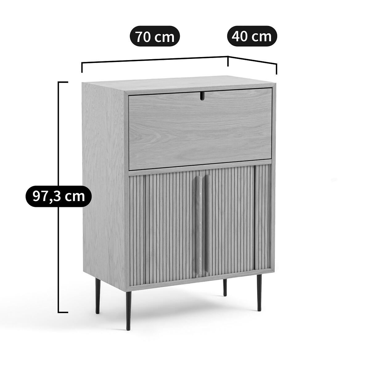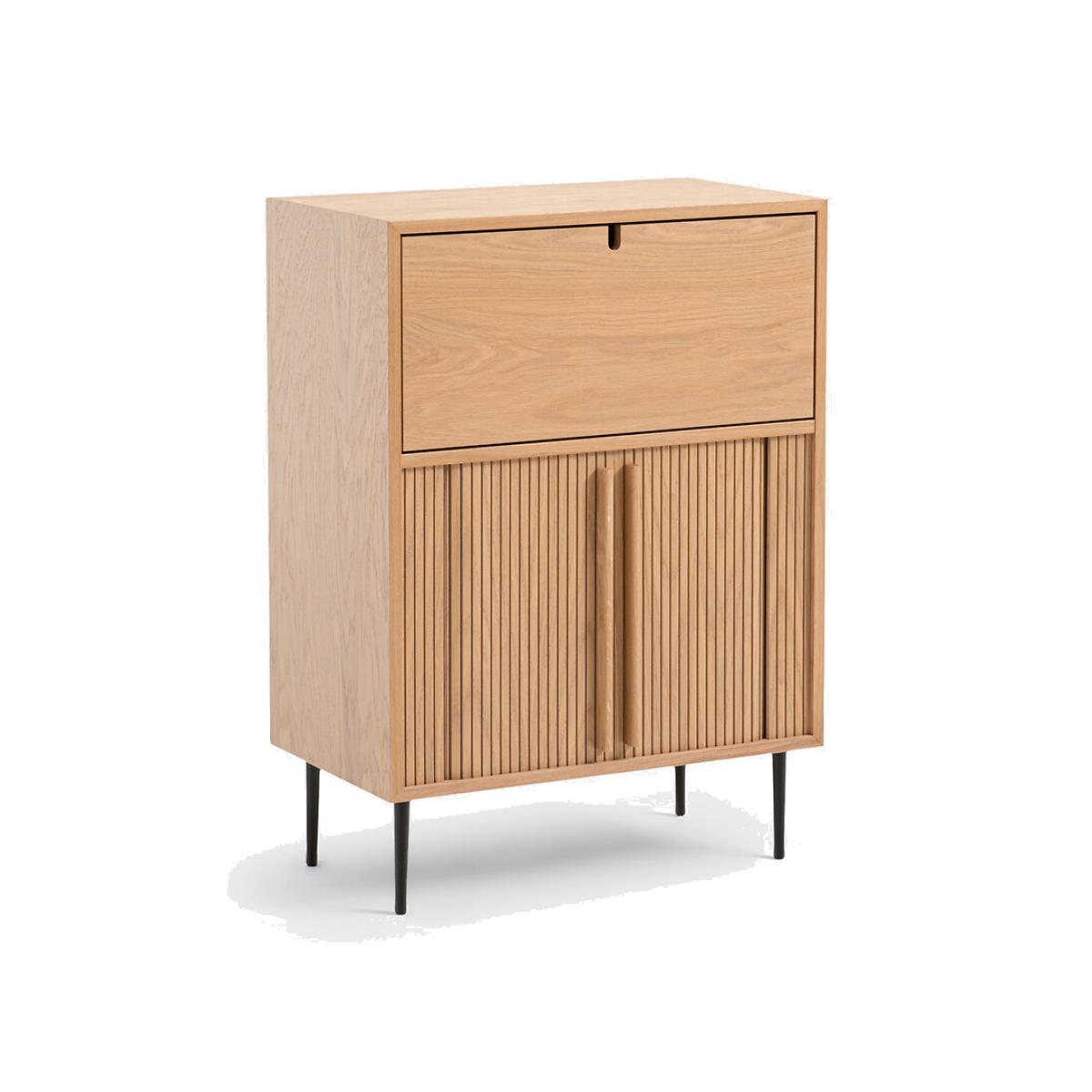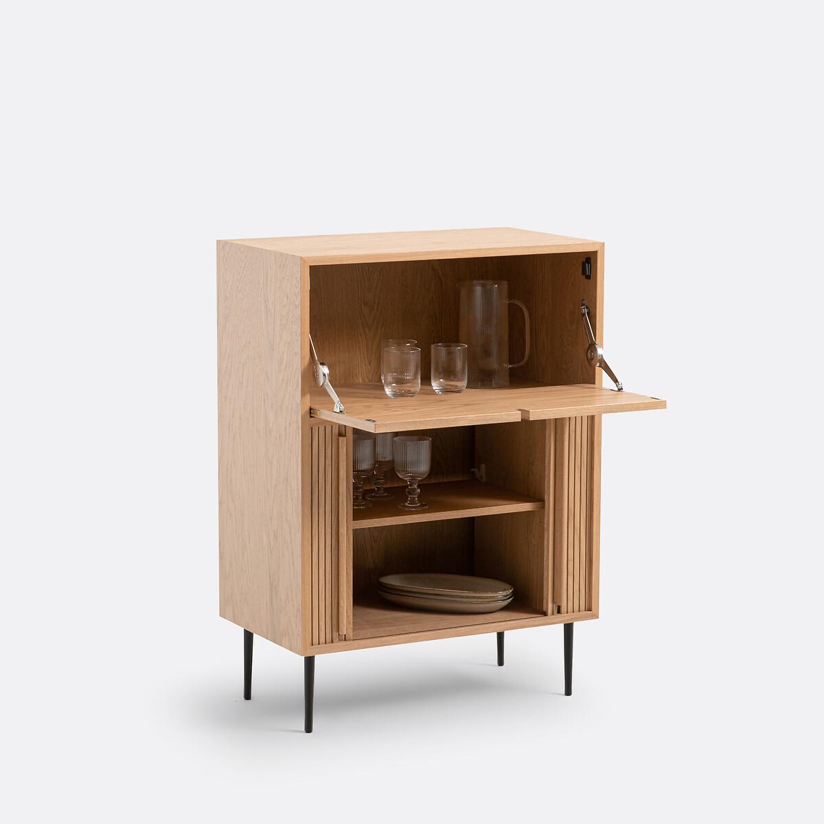 The Strio bar cabinet. Contemporary and stylish. It offers functional and practical storage space via its solid oak sliding door system. A design by La Redoute Interiors, made in Europe. Product Details • Unit assembled in oak veneered particle board, matte varnish finish • Drop-down door and shelves in melamine oak panels • 2 sliding doors with slats in oak veneered MDF, matte varnish finish • FSC® certified wood • 4 steel tube legs, black paint finishDimensions. Total • Width: 70cm • Height: 97.3cm • Depth: 40cm. Usable space • Compartment with drop-down door:L66.2 x H30 x D40cm • Compartments with sliding doors: L66.2 x H22.15 x D40cmDelivery:. This product requires assembly. Available for home delivery. • Made in Europe. • WOOD FROM SUSTAINABLY MANAGED FORESTS. FSC® certified wood comes from forests that are environmentally, socially and economically well managed. Dimensions and weight of parcel1 parcel • L80 x H90 x D50cm, 39kg