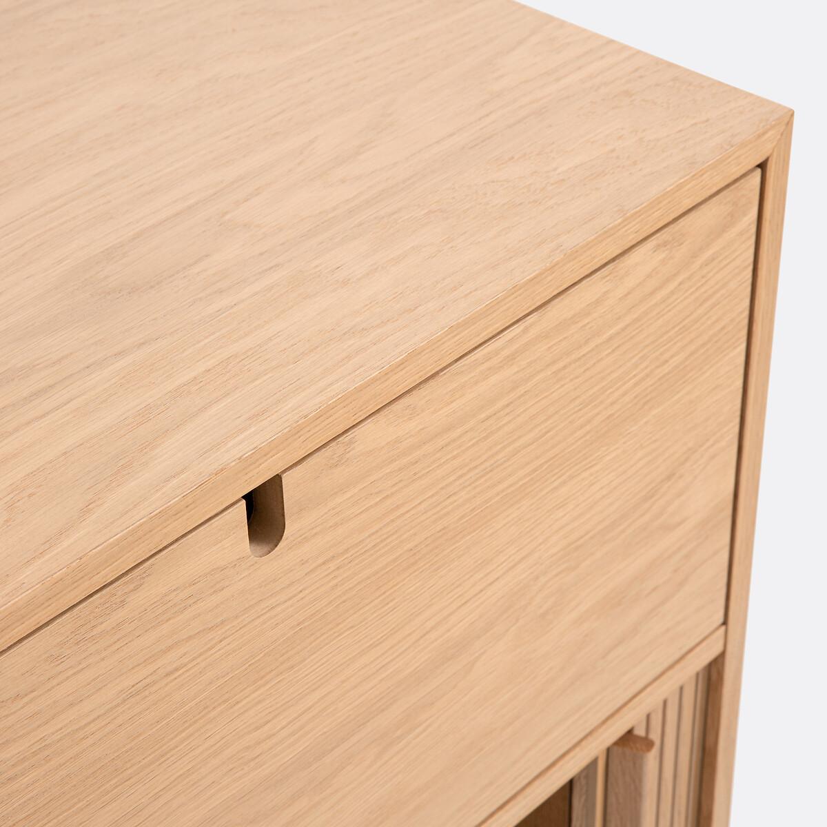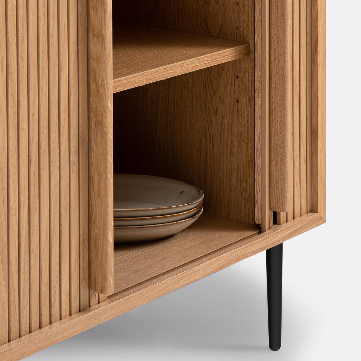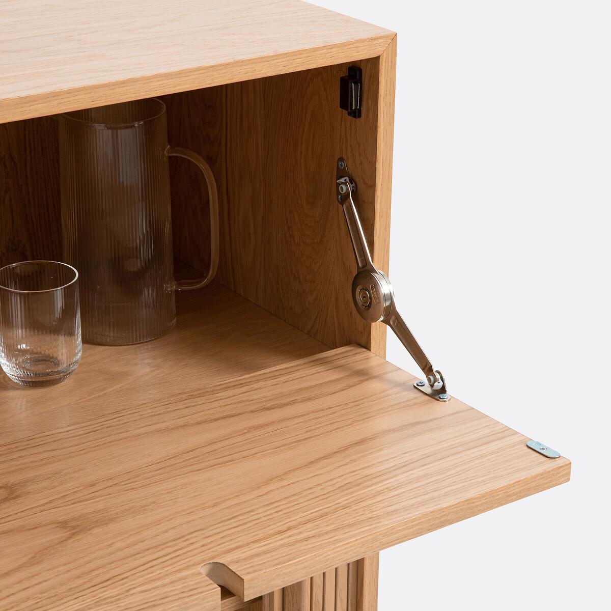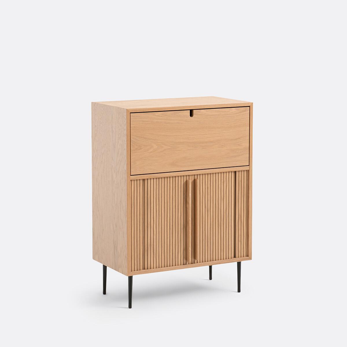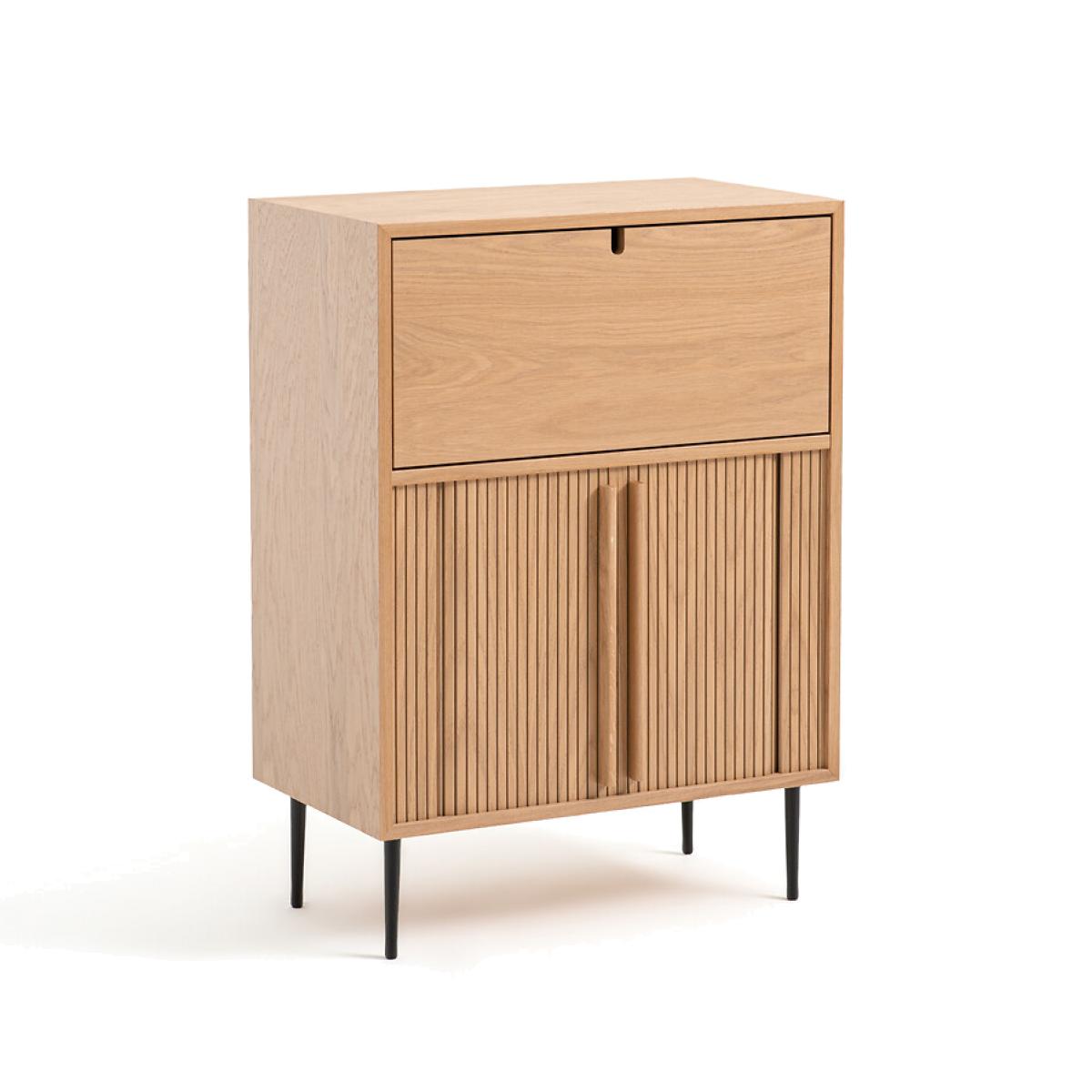 The Strio bar cabinet. Contemporary and stylish. It offers functional and practical storage space via its solid oak sliding door system. A design by La Redoute Interiors, made in Europe. Product Details • Unit assembled in oak veneered particle board, matte varnish finish • Drop-down door and shelves in melamine oak panels • 2 sliding doors with slats in oak veneered MDF, matte varnish finish • FSC® certified wood • 4 steel tube legs, black paint finishDimensions. Total • Width: 70cm • Height: 97.3cm • Depth: 40cm. Usable space • Compartment with drop-down door:L66.2 x H30 x D40cm • Compartments with sliding doors: L66.2 x H22.15 x D40cmDelivery:. This product requires assembly. Available for home delivery. • Made in Europe. • WOOD FROM SUSTAINABLY MANAGED FORESTS. FSC® certified wood comes from forests that are environmentally, socially and economically well managed. Dimensions and weight of parcel1 parcel • L80 x H90 x D50cm, 39kg