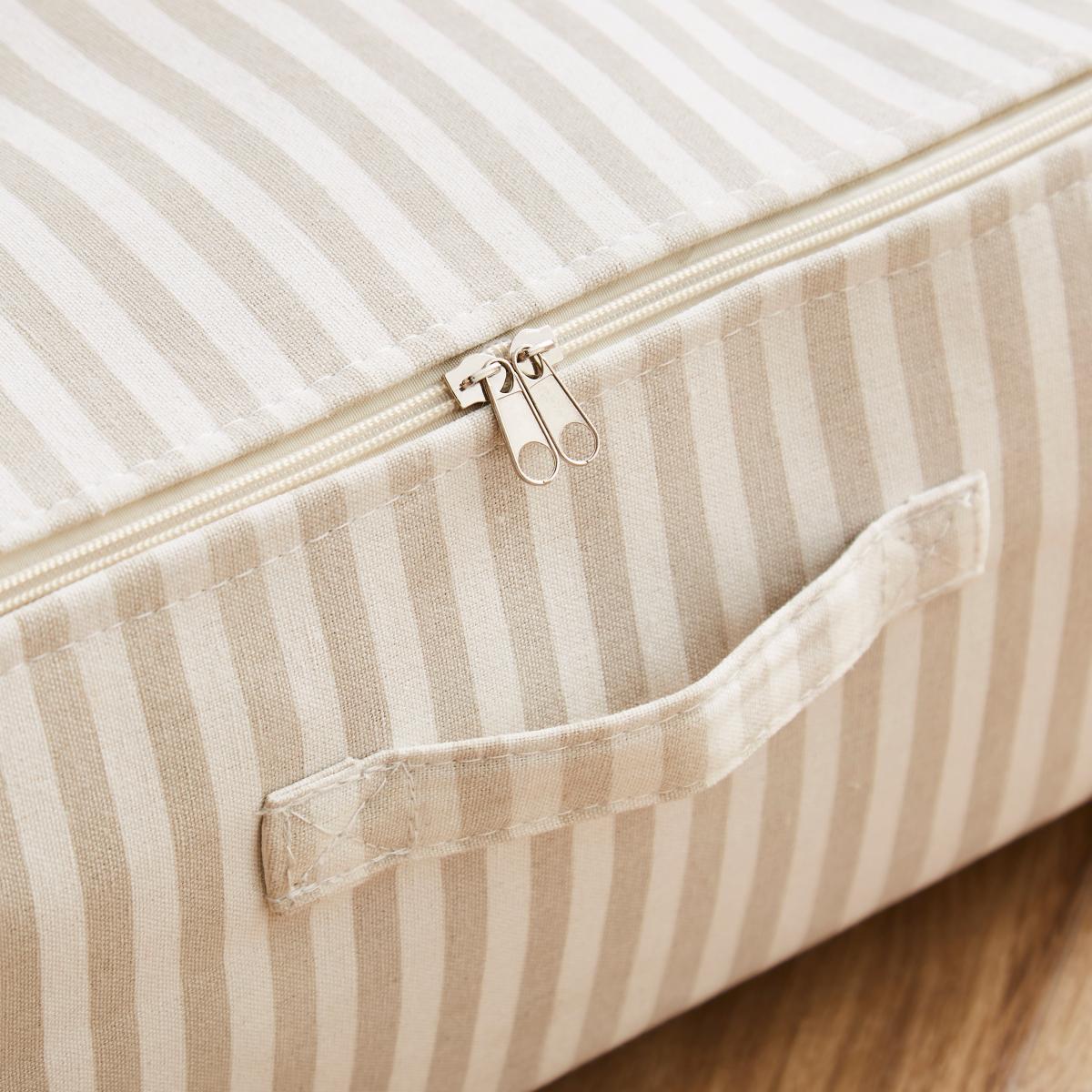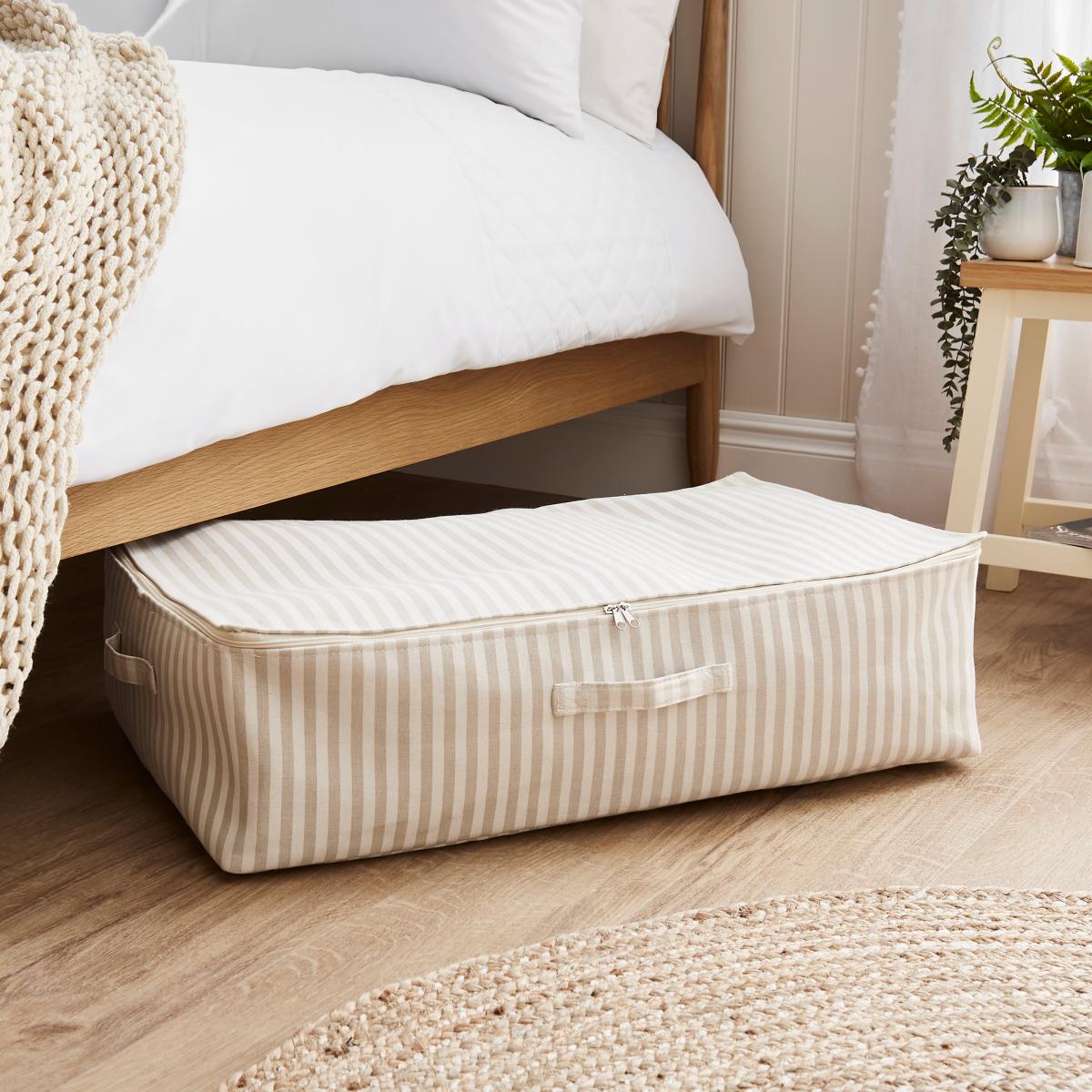 I love this striped underbed bag for its practical yet stylish approach to storage. The mushroom tone keeps it subtle and versatile, fitting well with both neutral and patterned interiors. It works particularly well in contemporary, Scandinavian, or minimalist bedrooms where under-bed storage stays out of sight but remains easily accessible. Practical styling tips include pairing it with other storage baskets in complementary textures or colours to create a cohesive look, and keeping it sleek by using it for seasonal clothes, bedding, or shoes. Its understated design makes it an unobtrusive solution that helps keep bedrooms tidy without compromising on style.