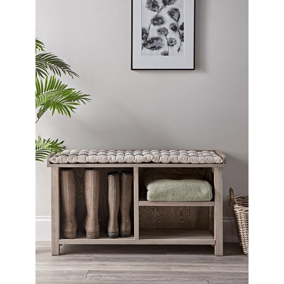 I love this so-called striped bench seat cushion for adding a cosy, inviting touch to a shoes storage or hallway area. Its neutral tones and subtle pattern make it versatile enough to work in both modern and rustic interiors, especially in schemes with natural wood or muted colour palettes. For styling, consider pairing it with baskets or organisers to keep shoes tidy, creating a functional yet stylish entryway. It’s also practical as a quick spot to sit while putting on or taking off footwear, and the padded top provides additional comfort. Keep the surrounding decor minimal to let the cushion be a soft focal point, or dress it up with a few textured throws or cushions for a layered, lived-in feel.