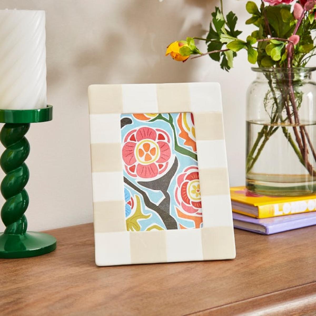 I love this label as a versatile addition to any shelf or mantelpiece. The striped ceramic photo frame adds visual interest with its bold pattern and ceramic finish, making it a standout piece in both contemporary and eclectic interiors. It works particularly well in kitchens, bedrooms, or living rooms where a pop of colour and pattern can brighten the space. For styling tips, try pairing it with other colourful décor or neutral pieces to let the frame stand out. It’s also perfect for showcasing seasonal photos or special memories, offering both functionality and style in one simple but eye-catching design.