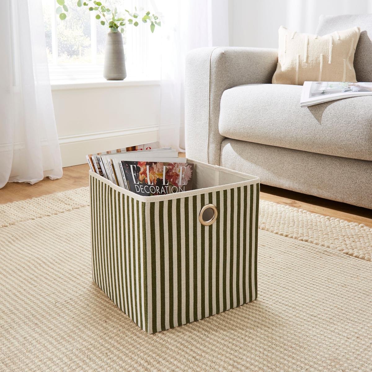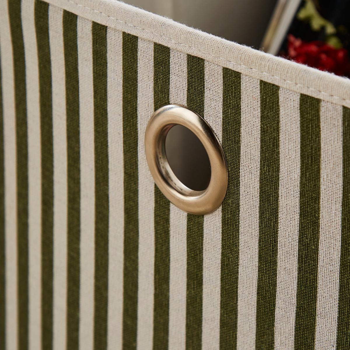 I love this foldable basket for its practical yet stylish appeal, especially with its chic olive green colour and striped design. It works particularly well in both modern and traditional interiors, adding a pop of colour without overwhelming the space. Its foldable feature makes it versatile for storage in wardrobes, under beds, or on shelves, allowing you to keep things organised and tidy. For styling tips, consider using it to contain household essentials like throws, magazines, or children’s toys, placing it alongside neutral or earthy tones to create a cohesive look. Its understated design makes it an easy addition to many spaces, adding function without sacrificing style.
