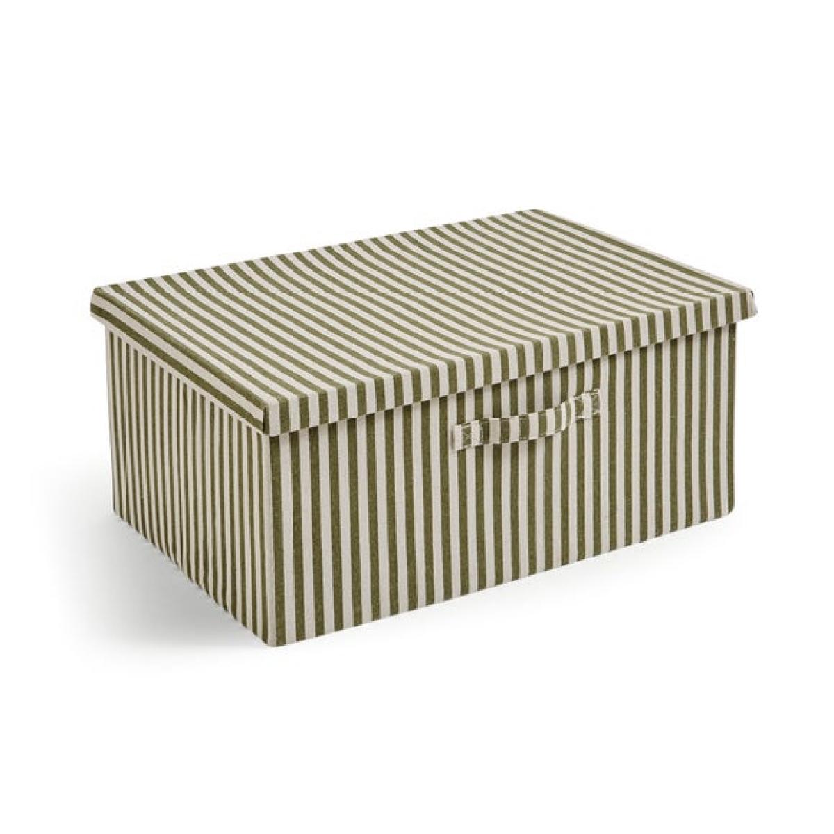 * Space saving box * Lid included * Handles for carrying Stylish and spacious, this large foldable box is finished in a chic stripe and designed with a handy lid and side handles. Whether you’re storing bedding, toys or off-season clothes, it makes tidying up a breeze—and when space is tight, it folds away flat for easy stashing.