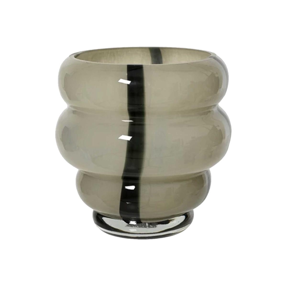 Introducing the Smoked Striped Glass Vase, a contemporary and distinctive piece showcasing a tiered bubble shape. Its smoked effect glass with dark stripes adds a stylish flair to any space. With its modern design, the possibilities for styling this vase throughout your home are endless, elevating your decor with a touch of sophistication.