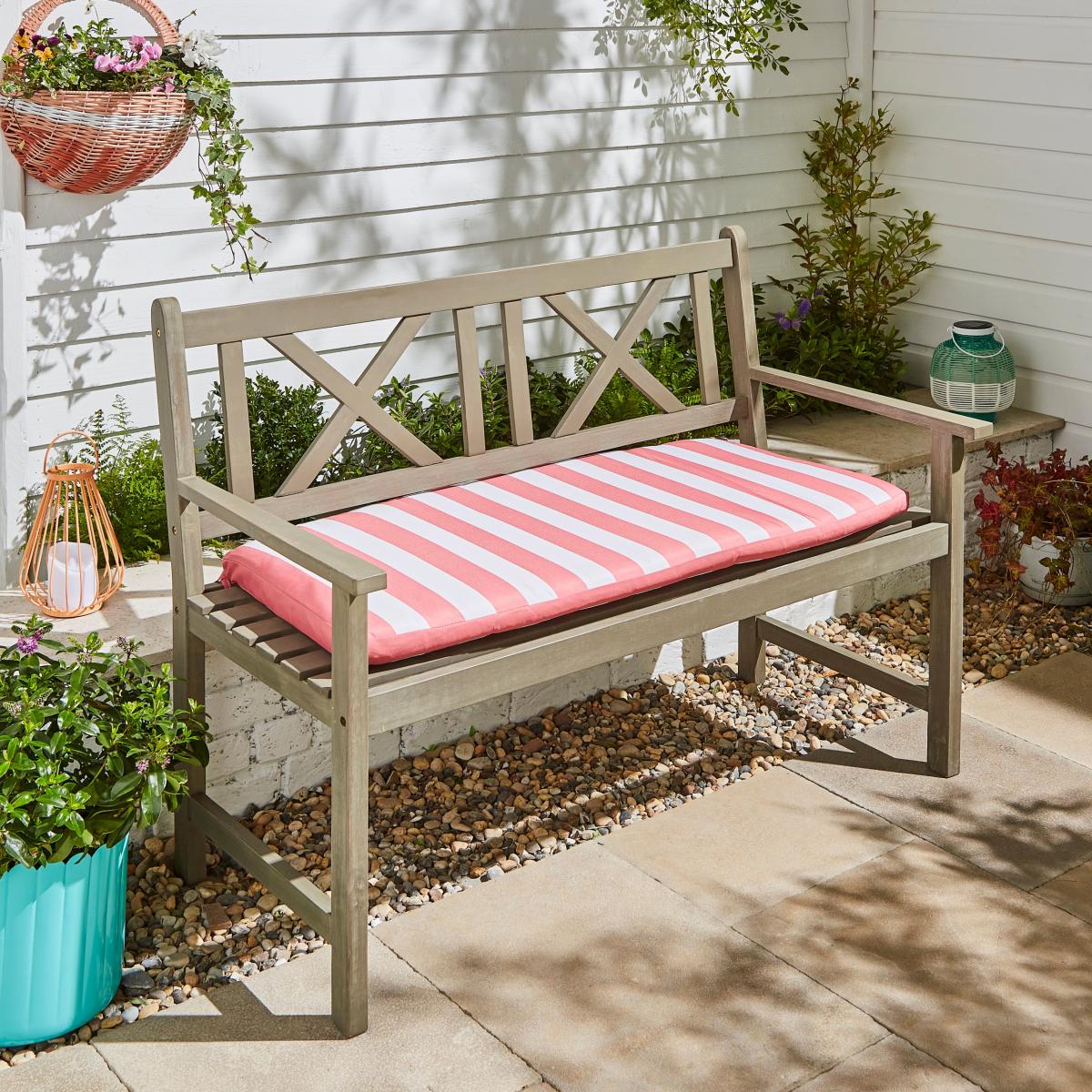 * Bold striped design * Padded cushion for comfort when sitting outside * 105cm Length * Sponge Clean only Transform your outdoor bench with the Coral Striped Bench Pad, featuring a bold and stylish striped design that adds a pop of colour to any garden setting. Measuring 105cm in length, this padded cushion ensures comfort for leisurely outdoor seating. Easy to maintain with a simple sponge clean, it's the perfect blend of practicality and style for your outdoor living space.